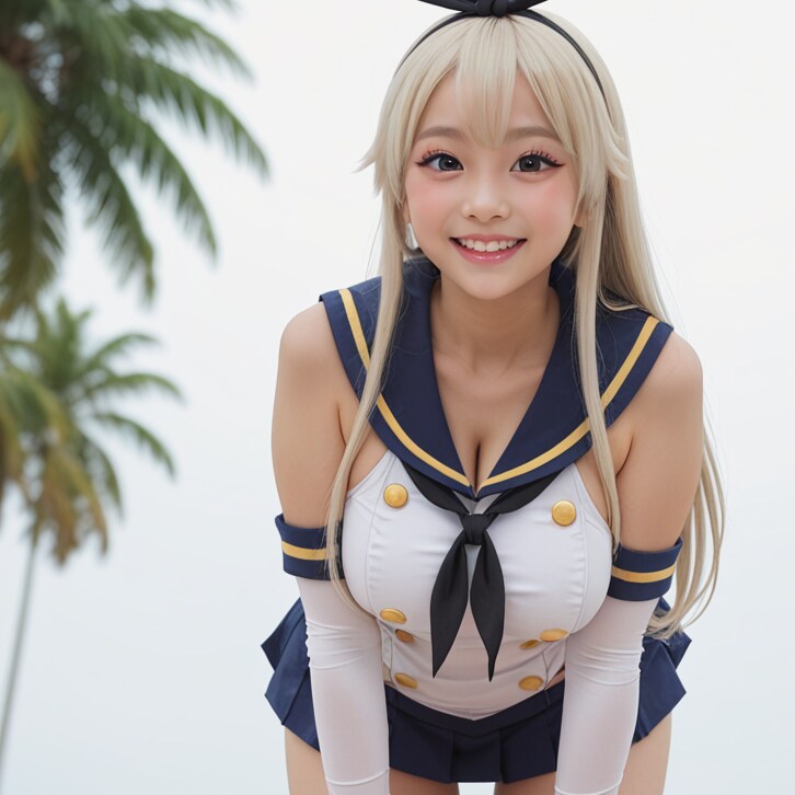 しまかぜコスの夏姫、めちゃくちゃ似合います。最高です。本来しまかぜはつるべたなんですが、コスプレ的にはおっぱいがあったほうが映えるので、夏姫のおっぱいそのままにしていますw そして、このマイクロミニスカートがまぁ絶妙な位置に来るんですよw 唯一出てくれなかったのが、ひだりもみあげについている碇の髪飾り。プロンプト指定したのですが、出てくれませんでした。