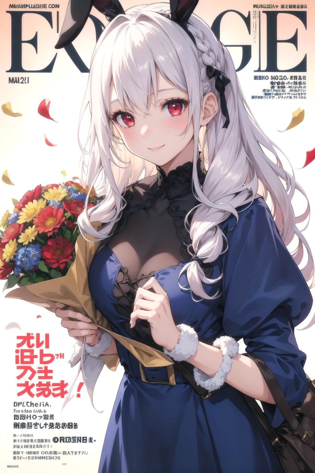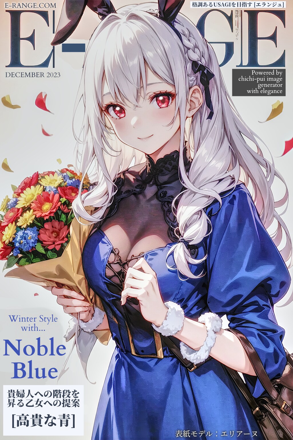 連続ランクインありがとうございます。ちちぷい生成機能を試して雑誌表紙を飾るシリーズ、またまた兎っ子のエリアーヌに今度は青いドレスでモデルになってもらいました。お金のある大人の20代~30代独身社会人USAGI女子向けの雑誌なのです。あっすべて妄想です。