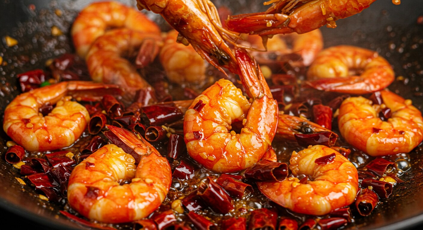 super red hot Stir-fried shrimp with chili sauce.