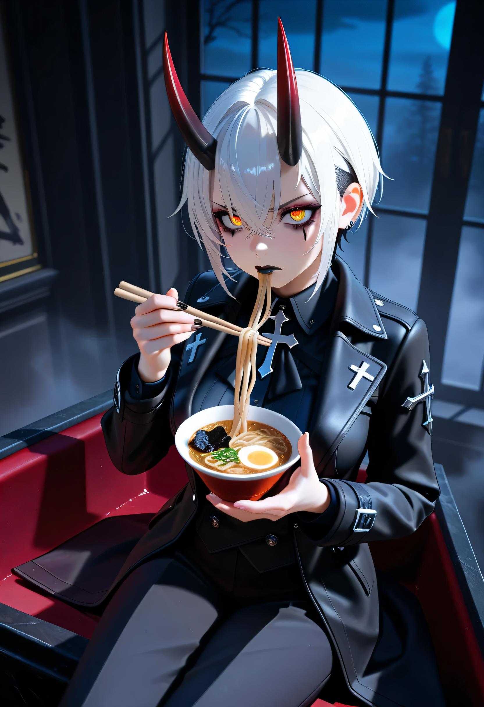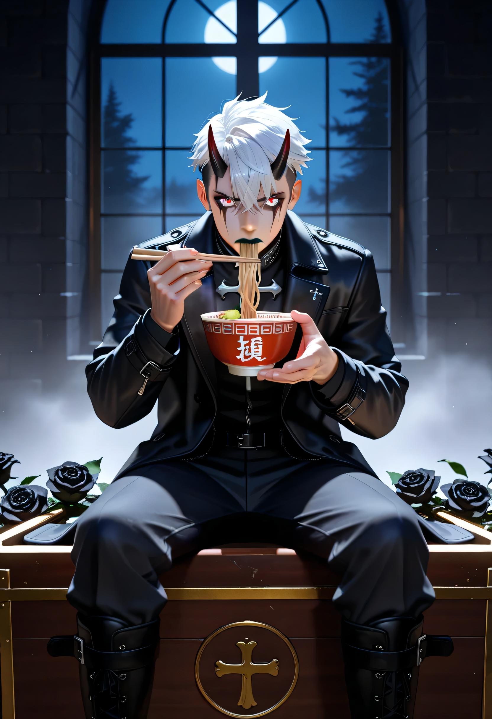 彼は4392歳の大悪魔で、ラーメンを姉の覇鎖丘シキブと共に夜食を食べる。「人類はウマイものを作るのがウマイな」と満足しながら麺を啜るのであった。