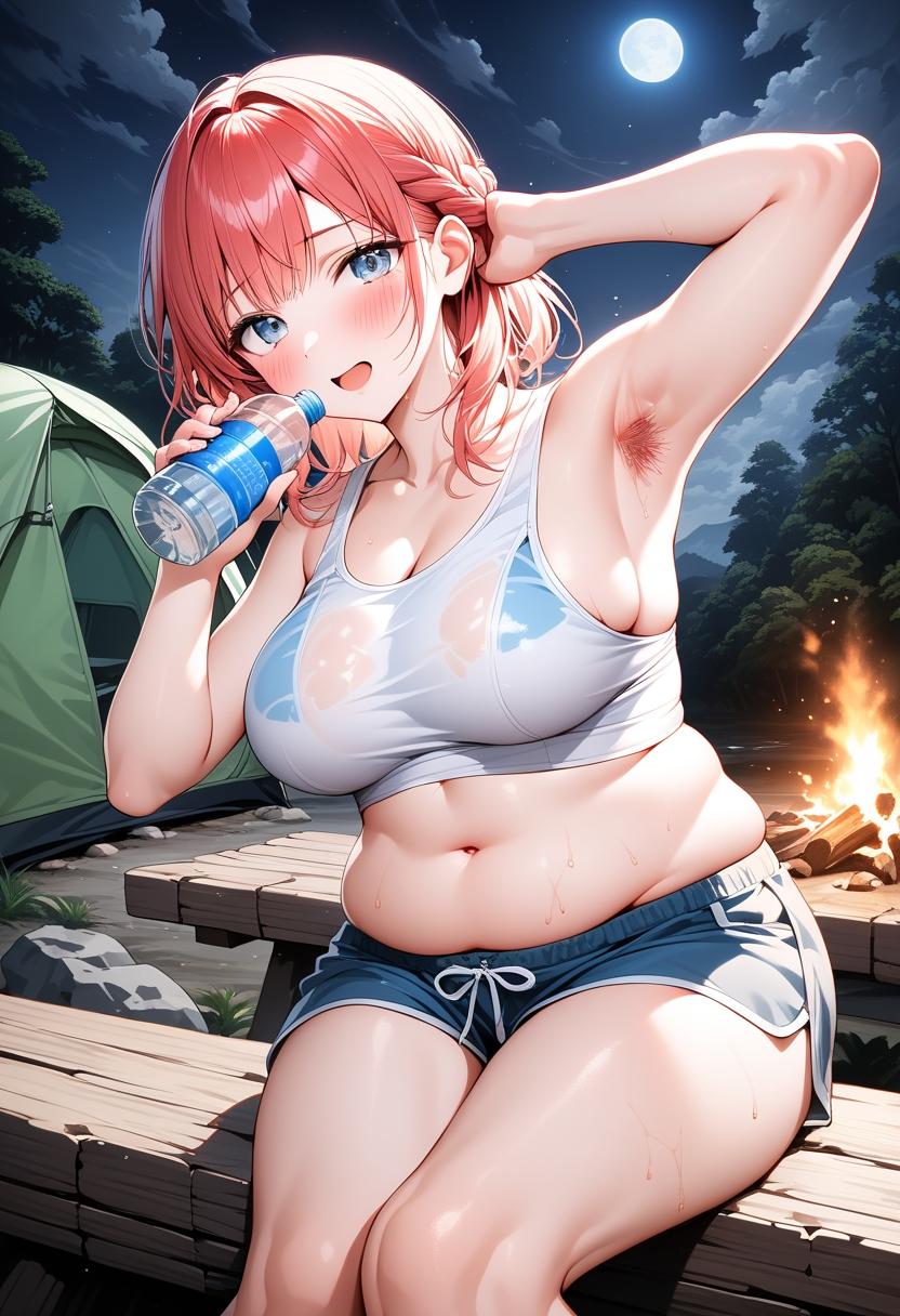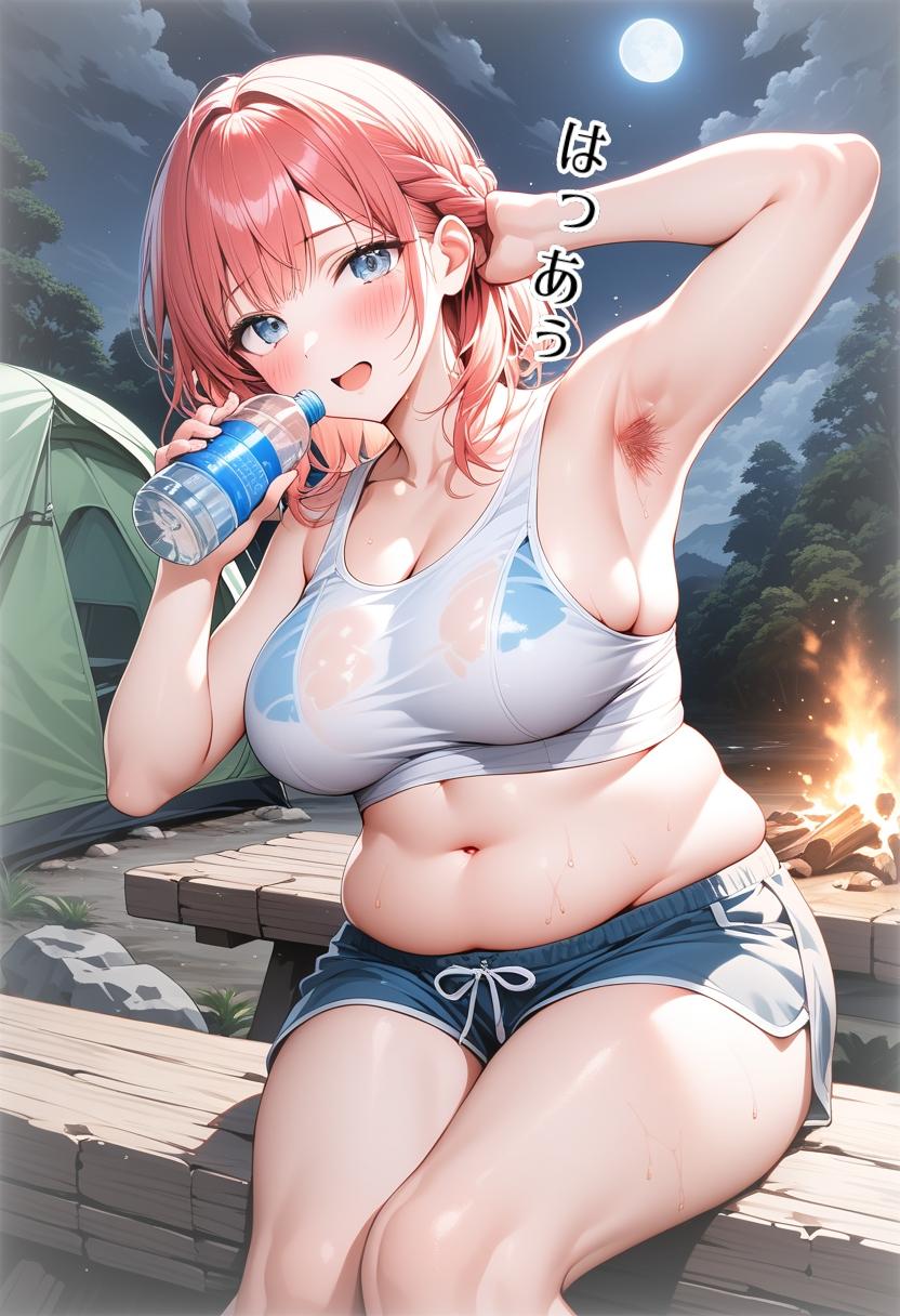 ふっくらなお腹と、二の腕を見せる