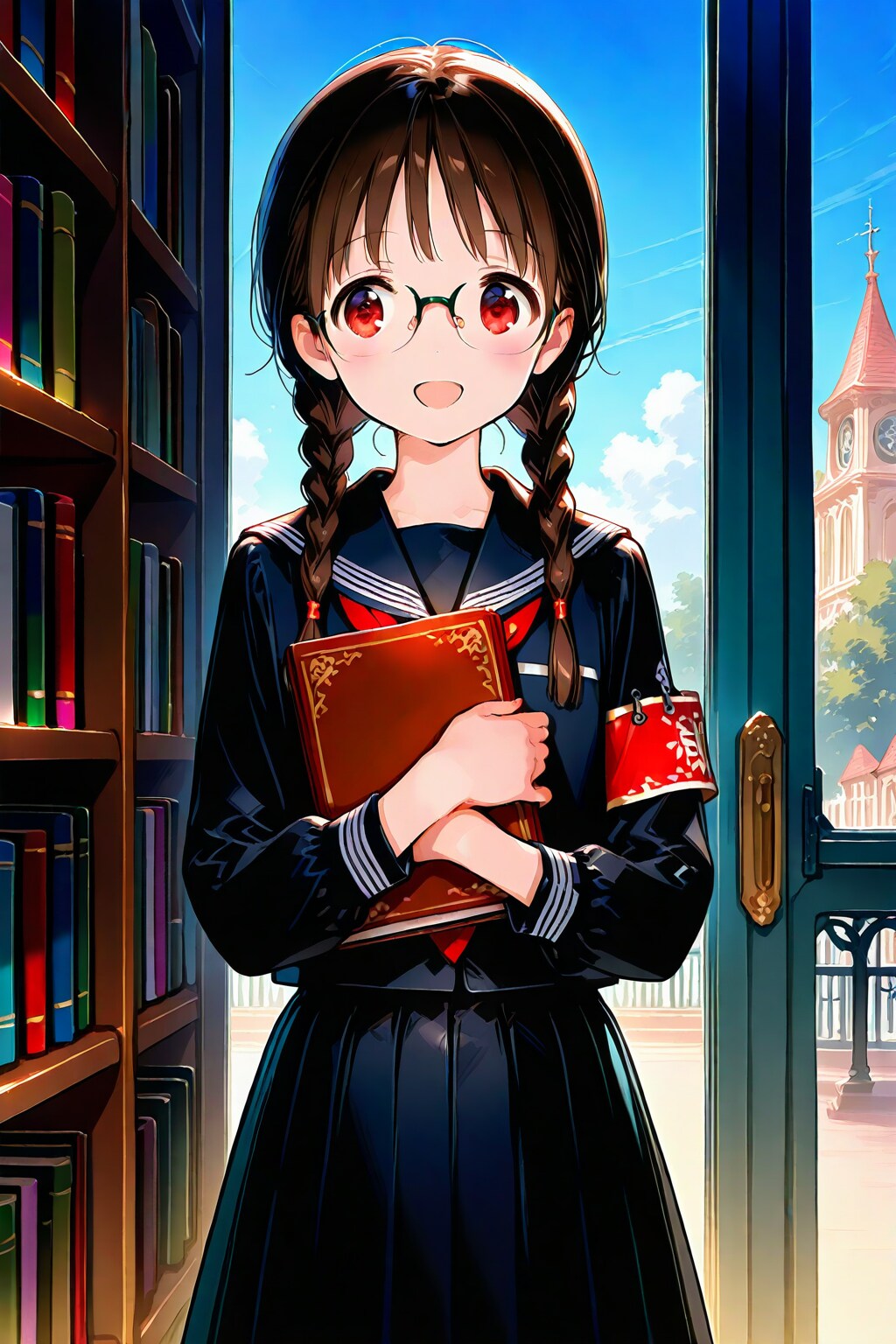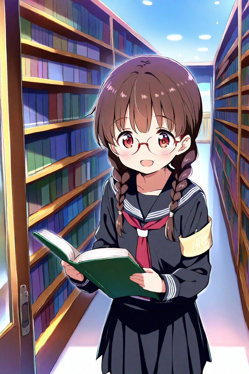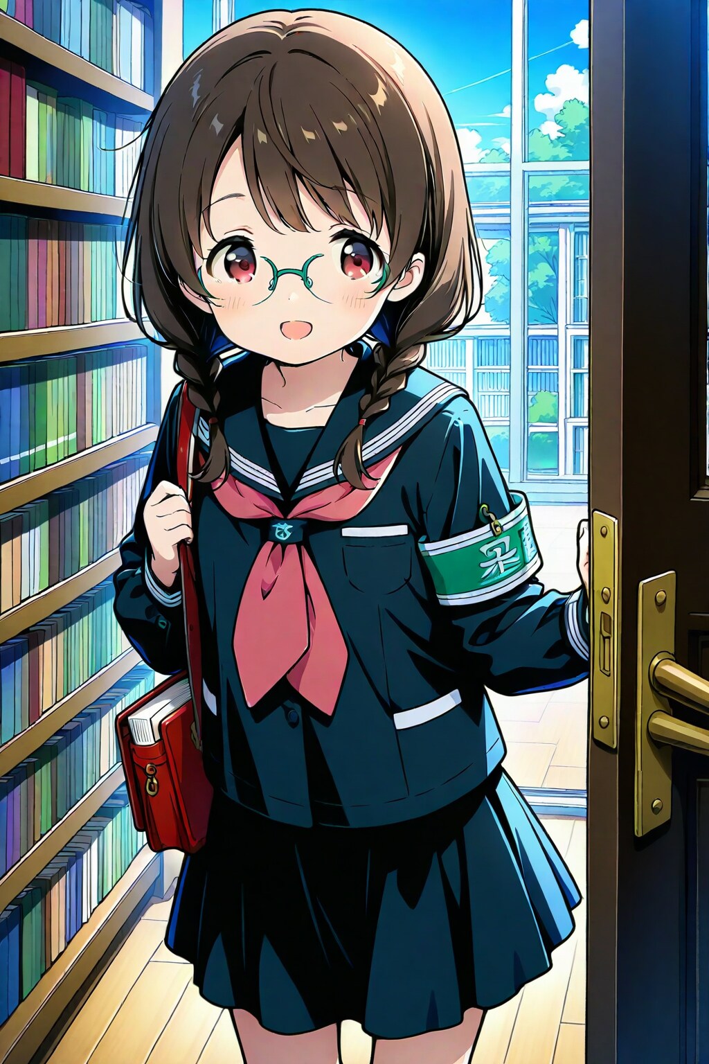 今回は図書館で本を持っている委員長ちゃんというお試しでよく使うプロンプトに出入り口、という要素を足してみました。PRISMは扉表現がうまくされず天井まで空化してしまうため外しています。