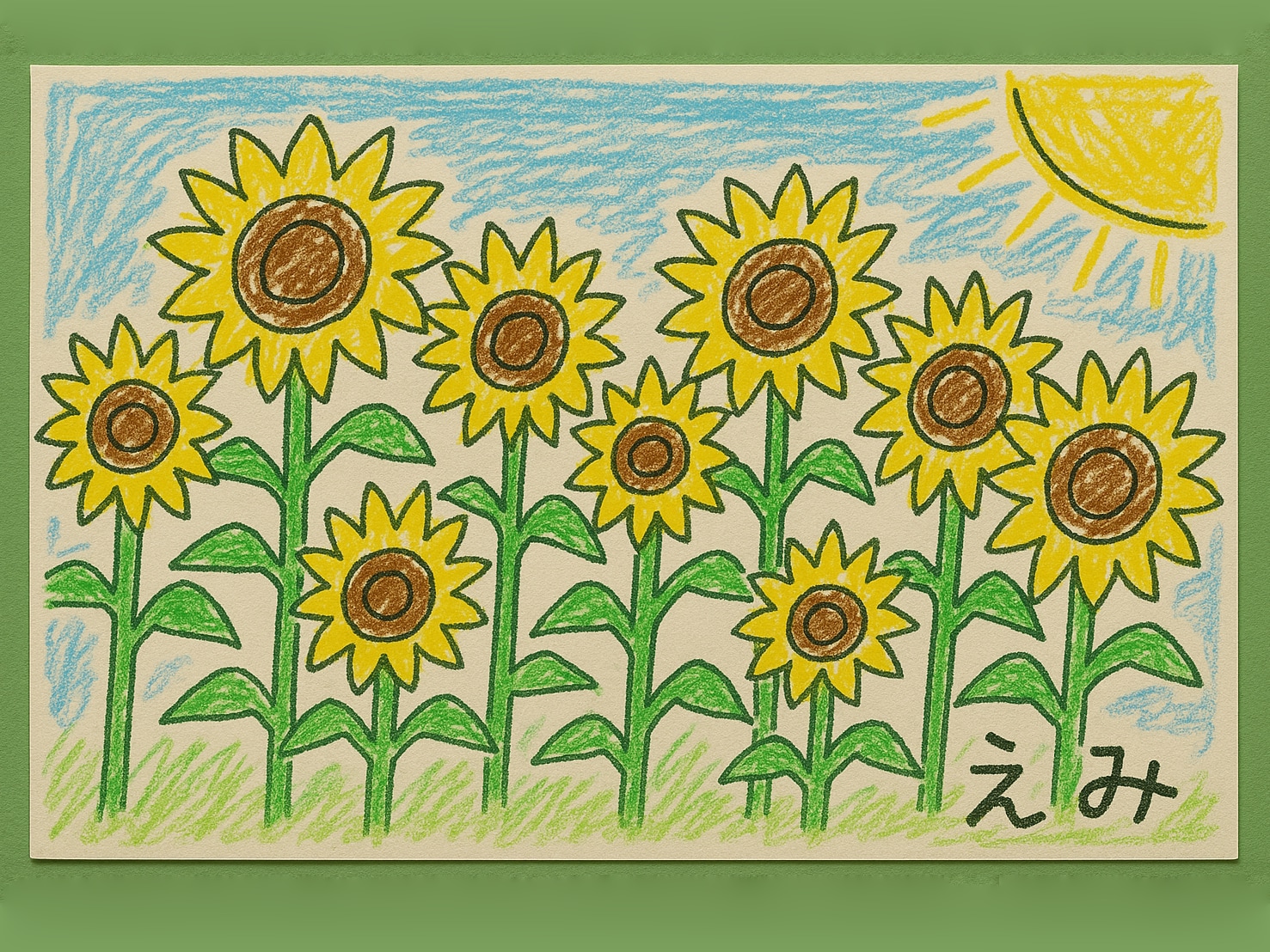 満面のひまわり畑でひまわりの絵を描く絵海ちゃん
