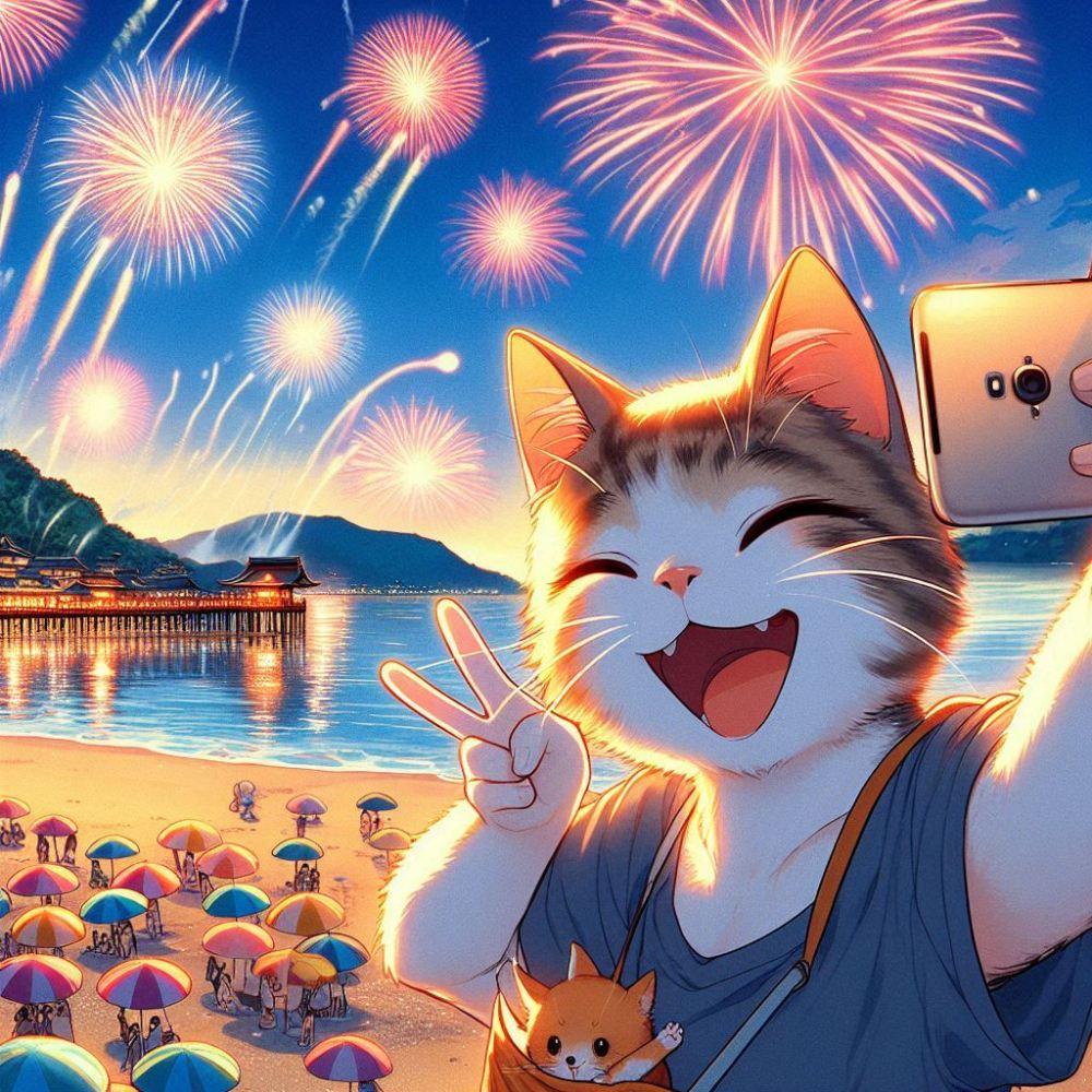 アニメ風 夏休み、花火大会、海岸、自撮りでピースサインする猫