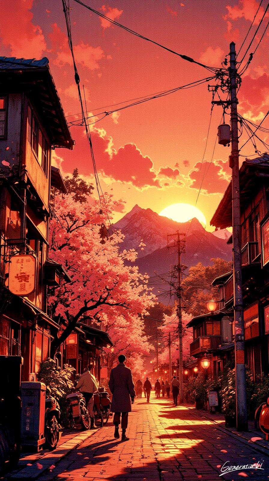 夕日が山の端に沈みかけ、空を燃やすような茜色に染めた頃、古い町並みにひっそりと続く桜小路に、彼は静かに足を踏み入れた。