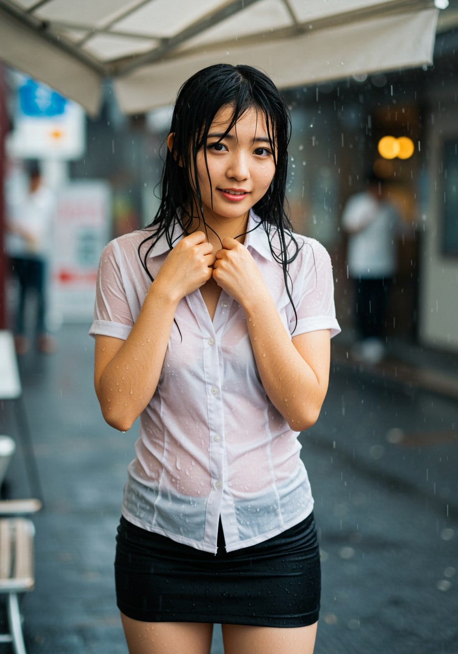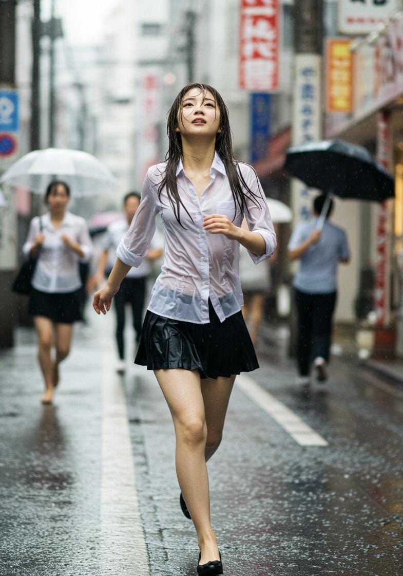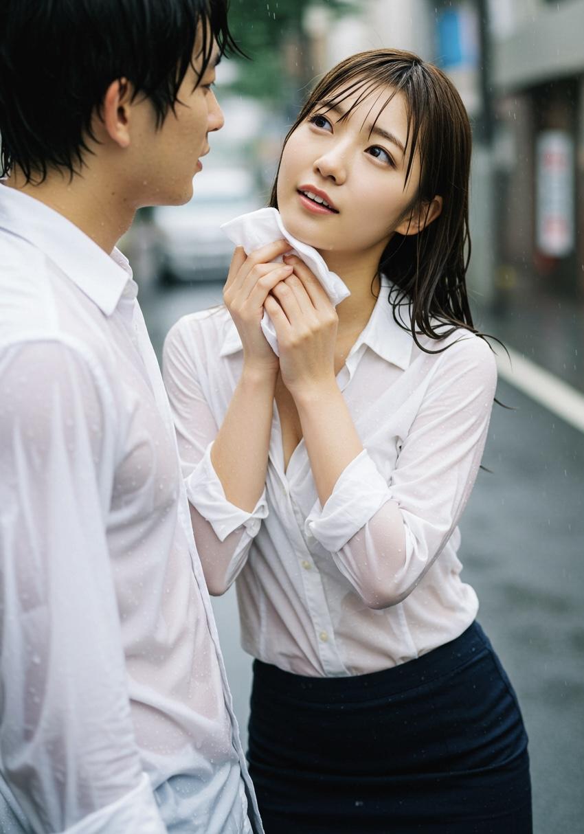 お昼のランチに出たOLが雨にあたり、ずぶ濡れに。すかさず男が出てきてハンカチを。