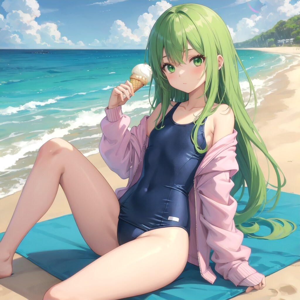 ◆メイドカフェ店員(緑髪、ロングヘア、緑色の目、25歳、料理が得意でカフェの料理担当、胸が平らの痩せすぎなアニメキャラ)が、カフェのメンバーと海水浴に行きました。他のメンバーより胸が特に小さく、「まな板」と言われがちな彼女はどのような水着を選択しそうでしょうか。