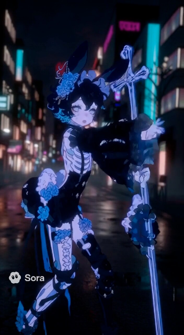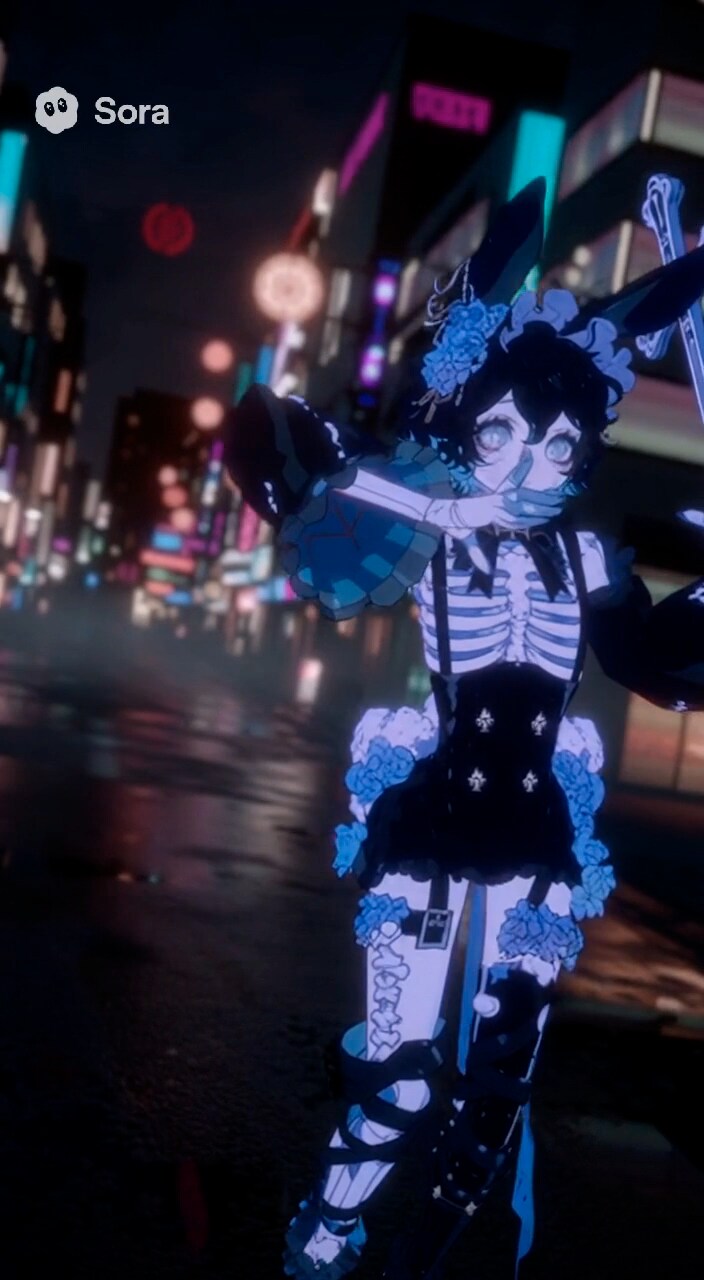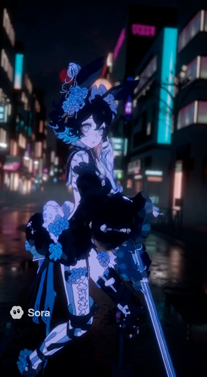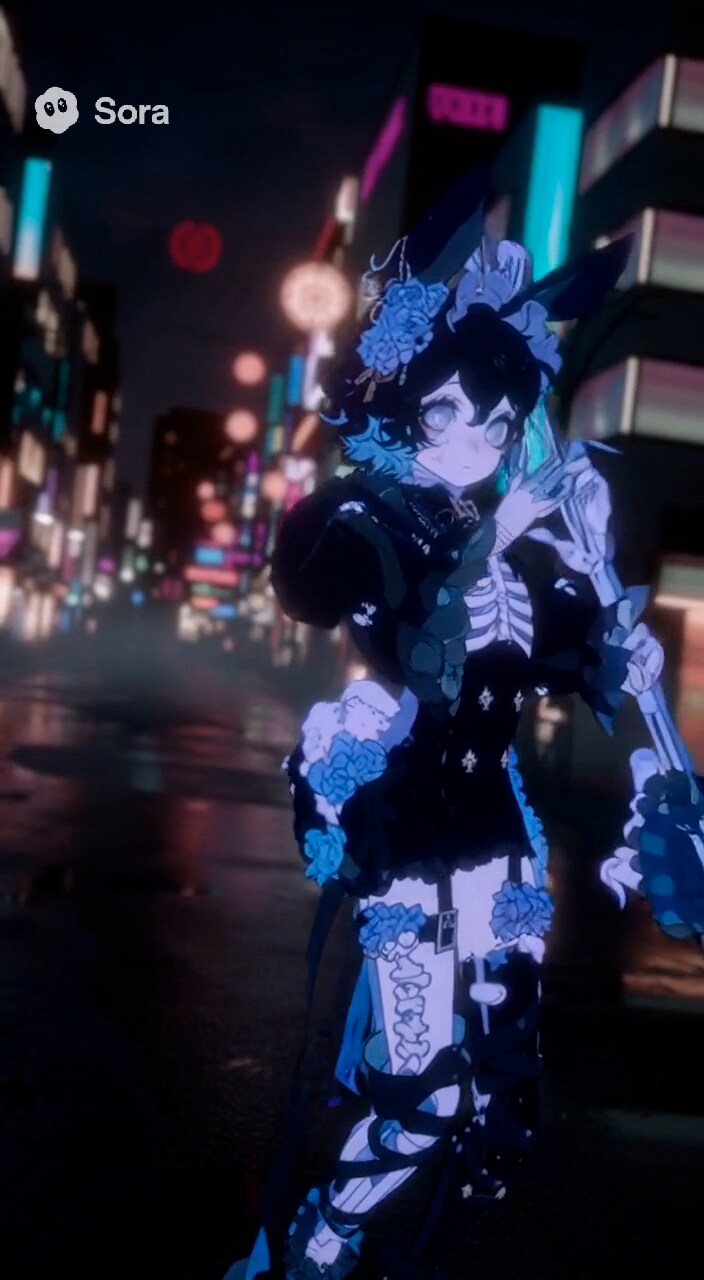 あらあら、皆様こんにちは。夜の街に佇む私を描いていただきましたの。背景のネオンがキラキラしていて、とっても綺麗でしょう?ドレスには青い薔薇のモチーフがあしらわれていて、お気に入りなんです。少しだけ未来的なデザインも取り入れてみました。皆様、気に入ってくださると嬉しいですわ。