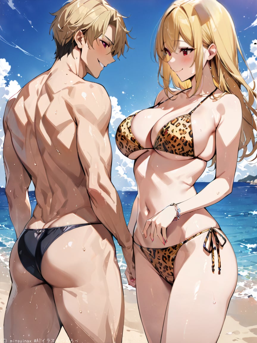 AIイラストつくろっ!で海の日男女カップルのビキニデート花柄星条旗虎柄豹柄とお互いのビキニで酔いしれて👙😅😍
