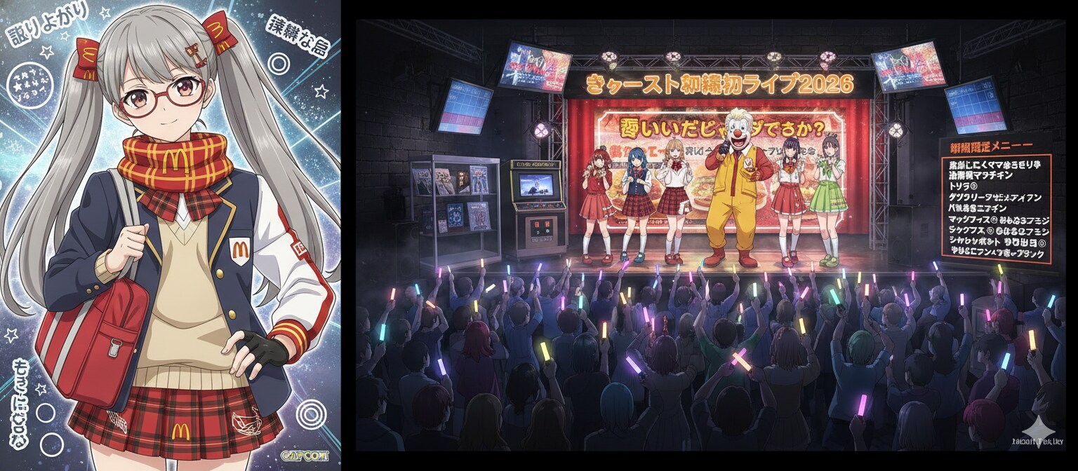 * **ユニークな組み合わせ:** マクドナルド、ストリートファイター、アイドルという異質な要素を組み合わせることで、他に類を見ない独特なイメージを生み出そうとしています。