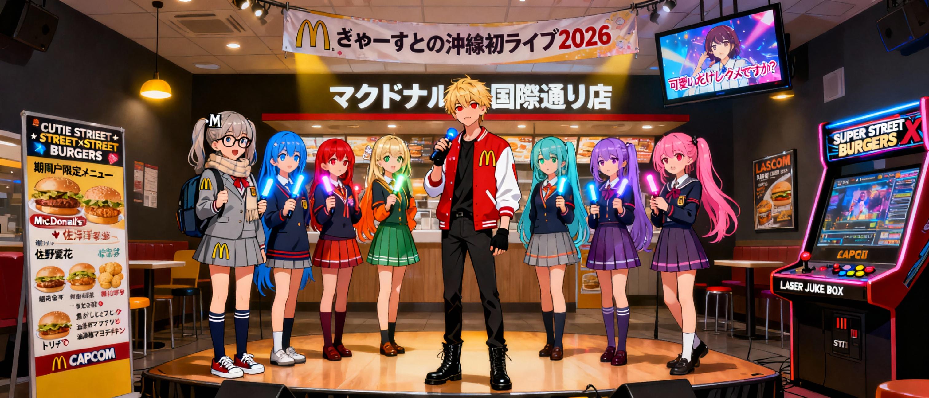 1. **要素の絞り込み:** 優先順位をつけ、最も重要な要素に絞り込むことで、AIがより明確なイメージで画像を生成できるようになります。例えば、マクドナルドのライブ会場に焦点を当てるなら、ストリートファイターの要素を削除する、あるいは、ストリートファイターのゲーム筐体を背景に、アイドルたちがいる、というシンプルな構図にするなど。
