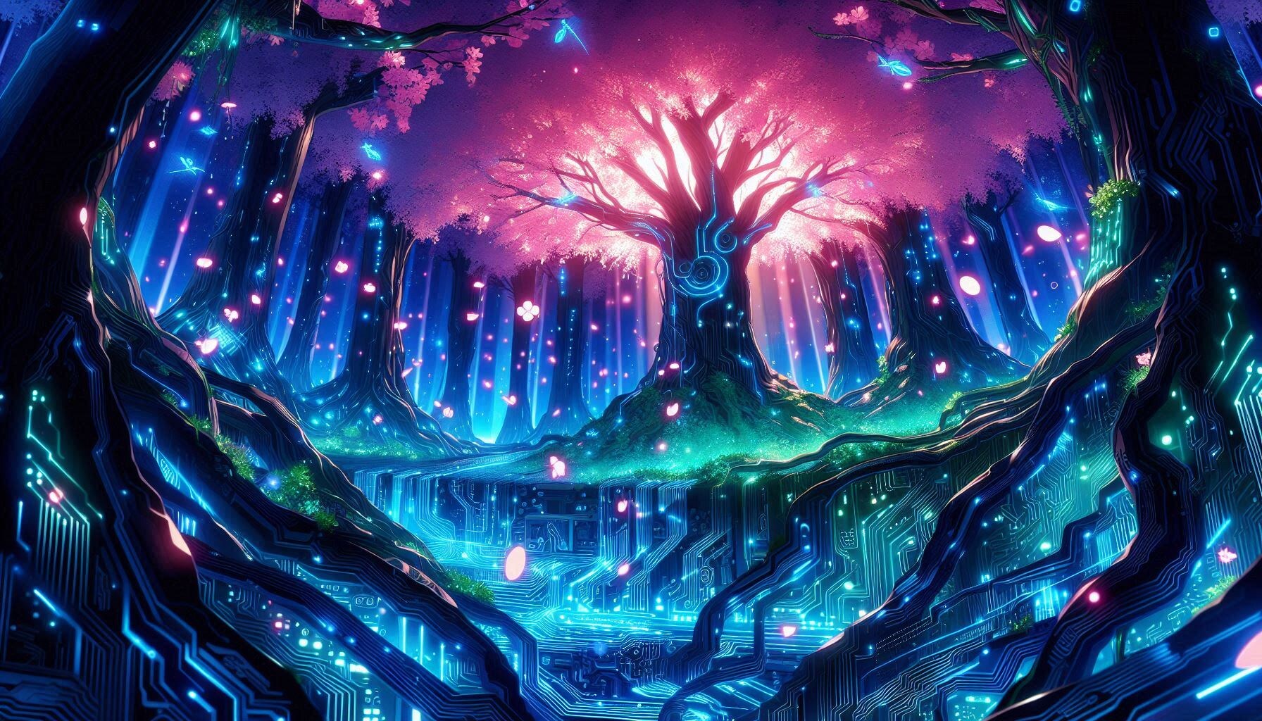A neon-lit forest with glowing flora and fauna, where the trees are circuit boards and flow with light.