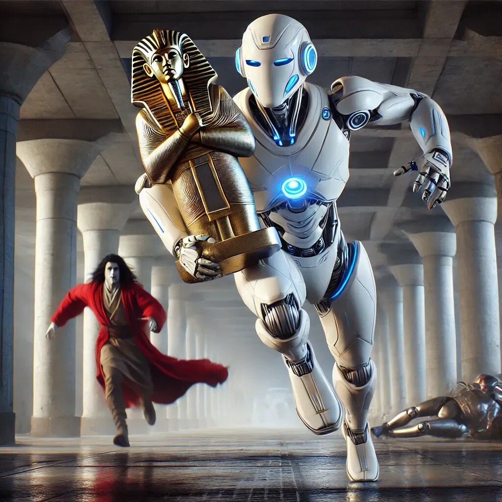 銀色のツタンカーメン像を守護する幽霊が赤いローブをまとい、ロボットを執拗に追いかける光景は、まるで冒険映画のワンシーンのようです。