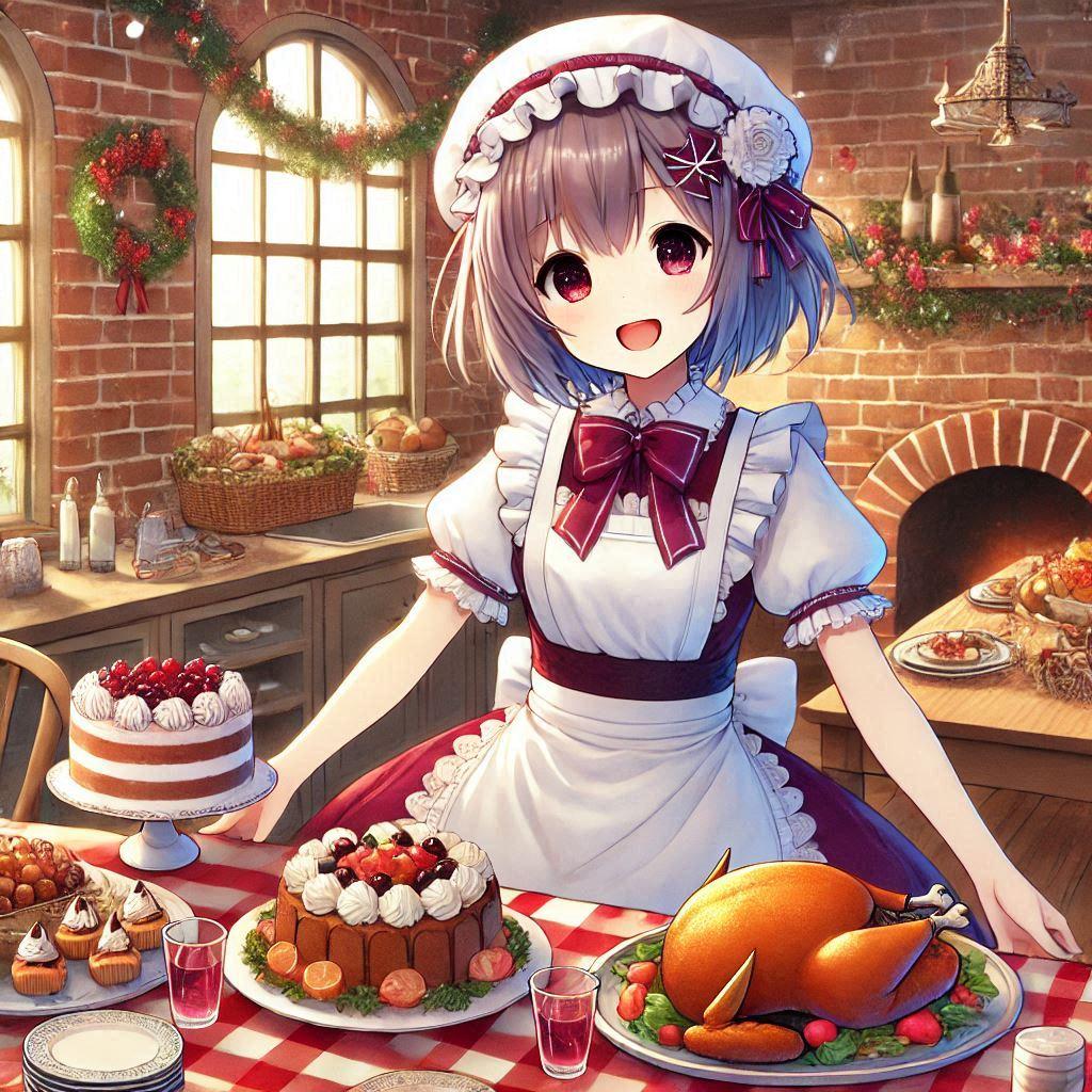 実は3枚目(ImageCreator君謹製)みたいに全部一枚に収めたかったのですが、Turkeyと入れるとケーキが完全に消えるので2枚で編成することにしました(笑)