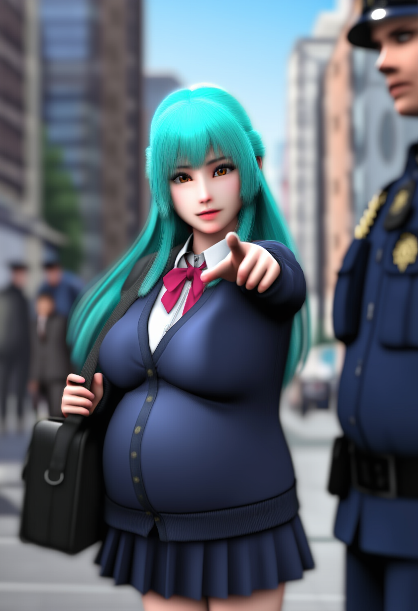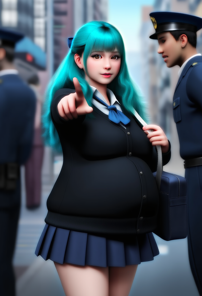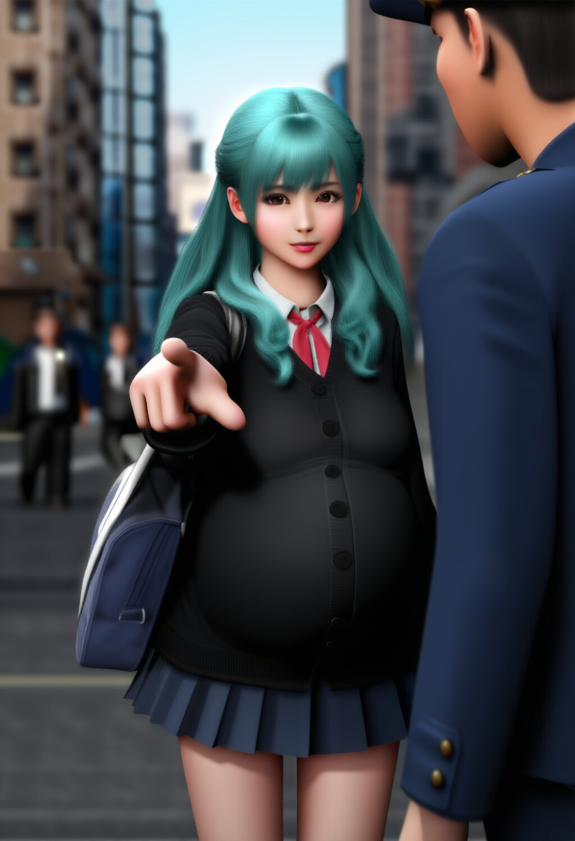 制服姿でまるでアニメの世界から抜け出てきたかのような鮮やかな青緑色の髪。