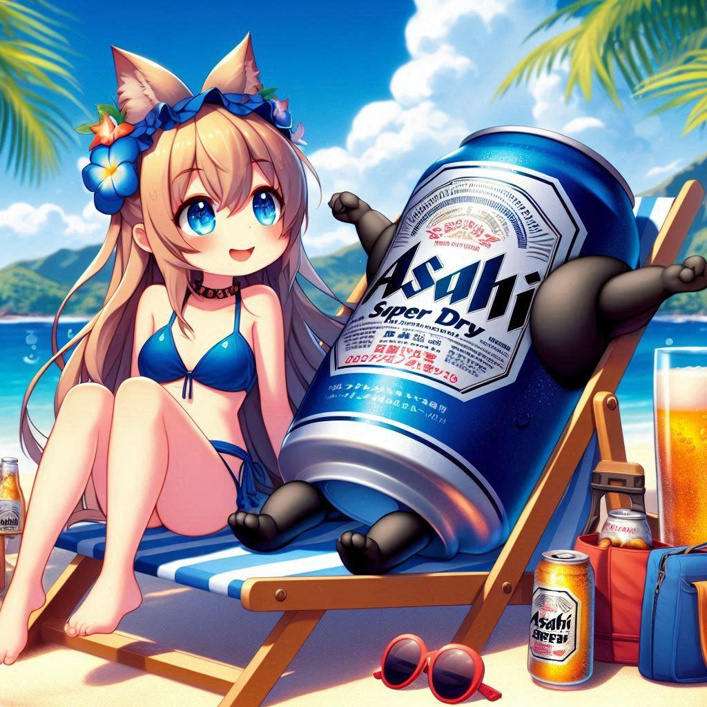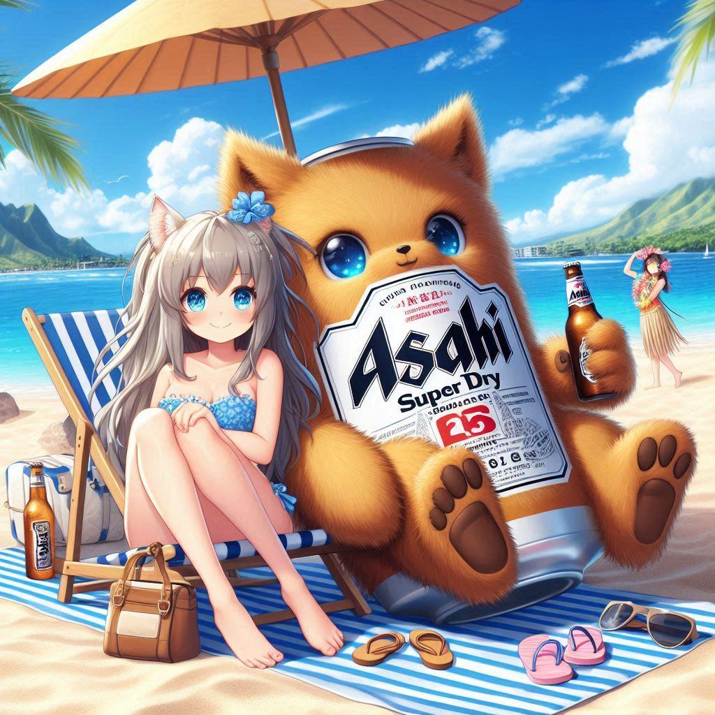 ハワイのビーチを堪能するビール缶と小さな女の子