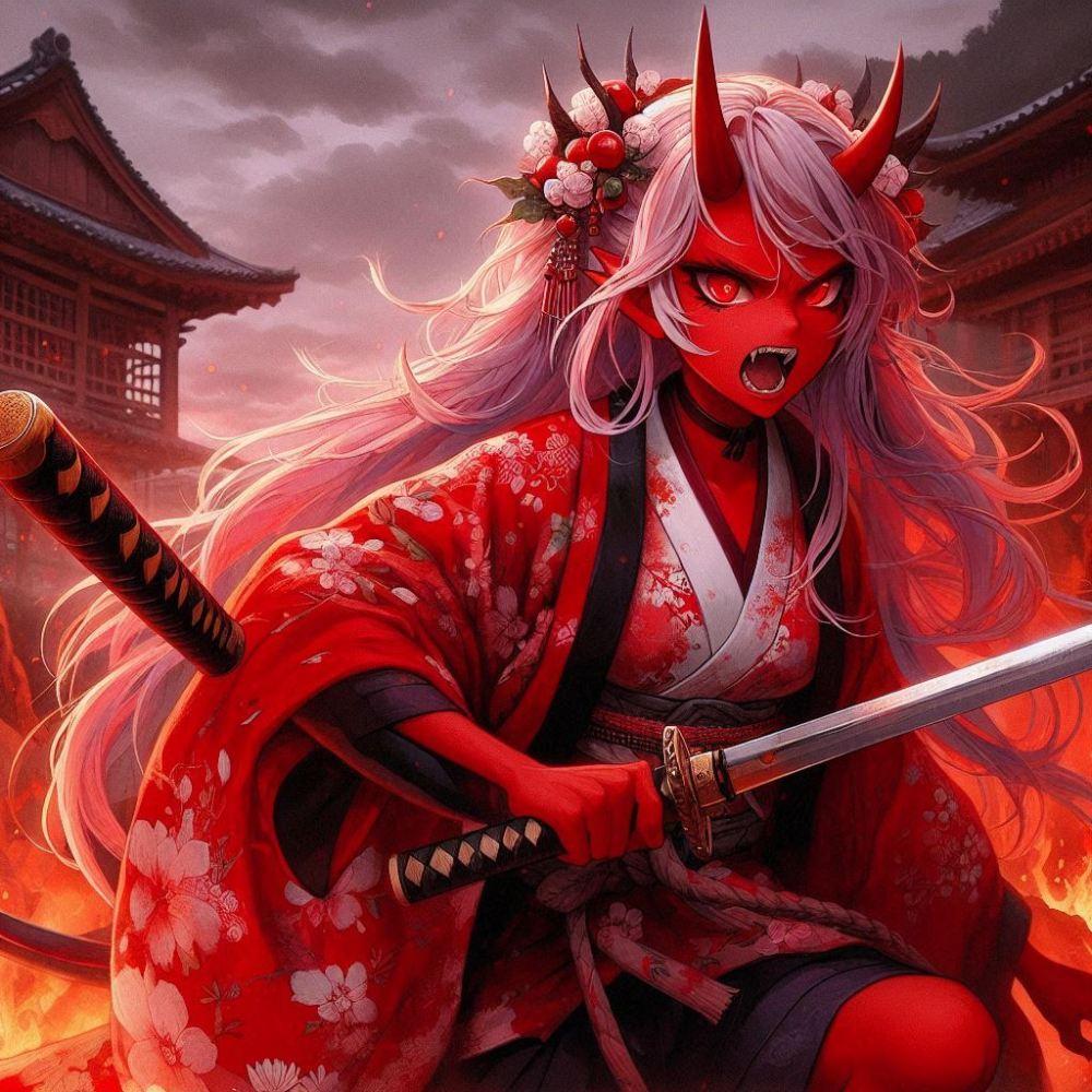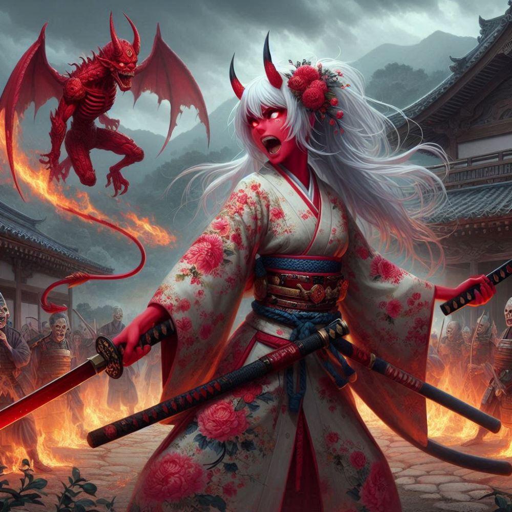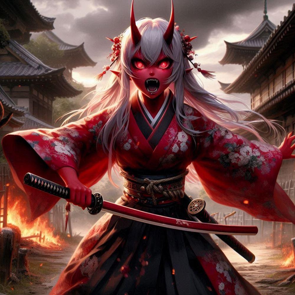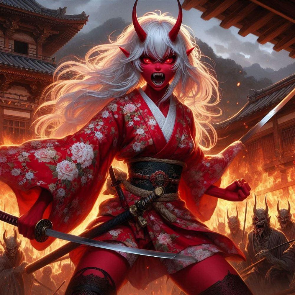 時代劇墨絵油絵風、サムライ赤鬼娘人妻ハイソックス