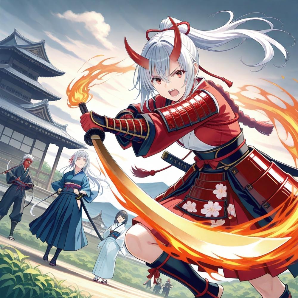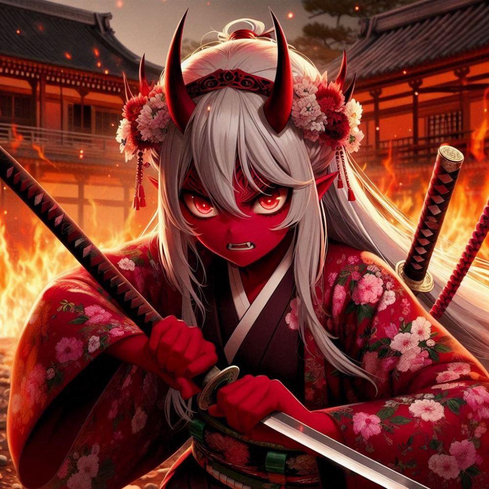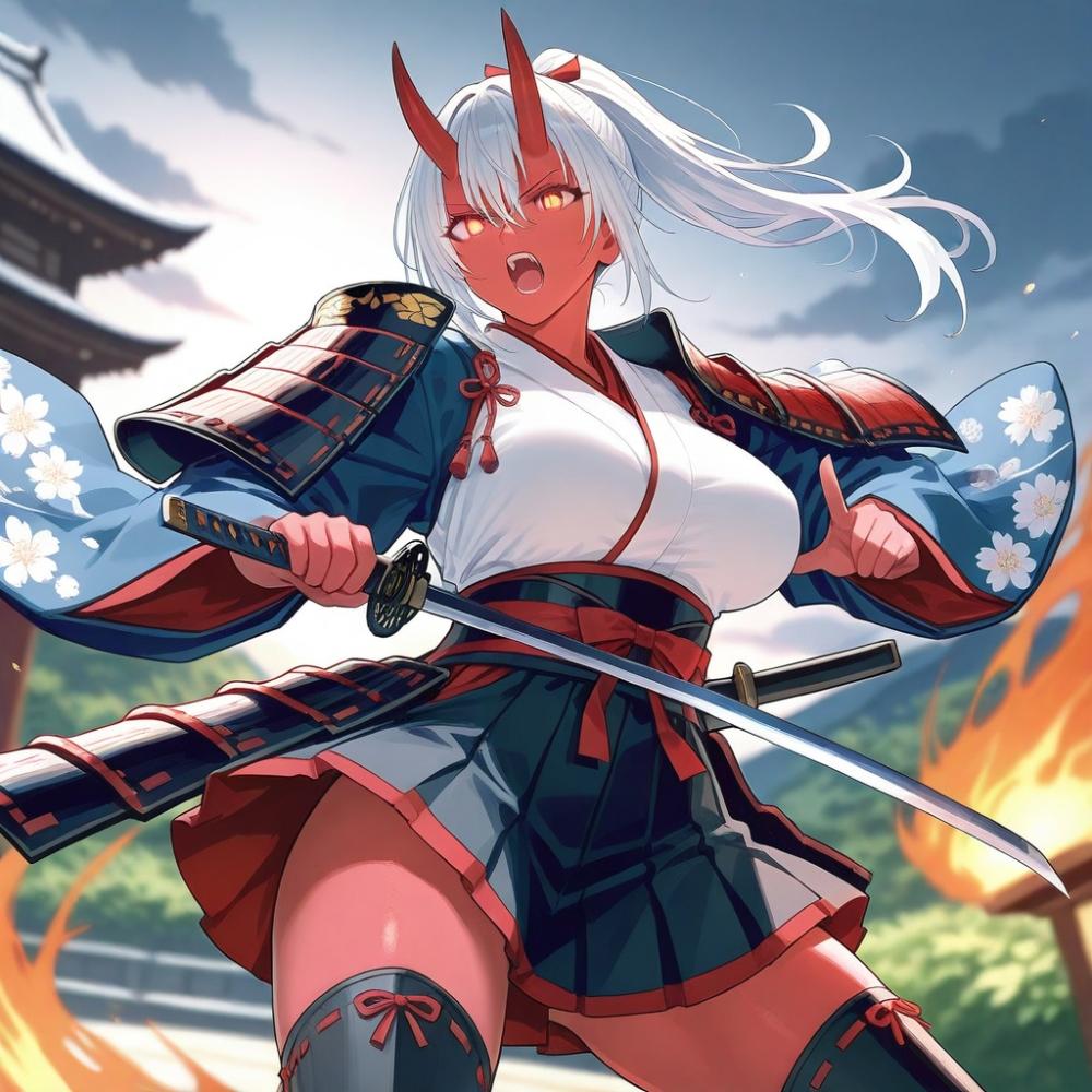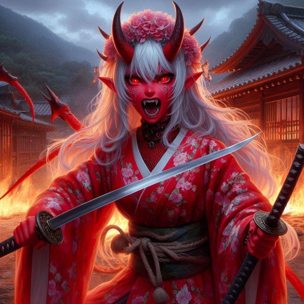 時代劇墨絵油絵風、サムライ赤鬼娘人妻ハイソックス