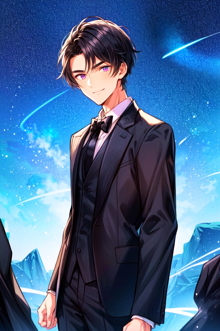 星空企画、黒髪短髪男性でも投稿!TOPAZでは謎の建築物が出てきて失敗だったので、ChromaFT_v3で生成してみました。当たればこのように綺麗な星空が見れてよかったです!!ただ図形の星の確率も高めでしたー。
