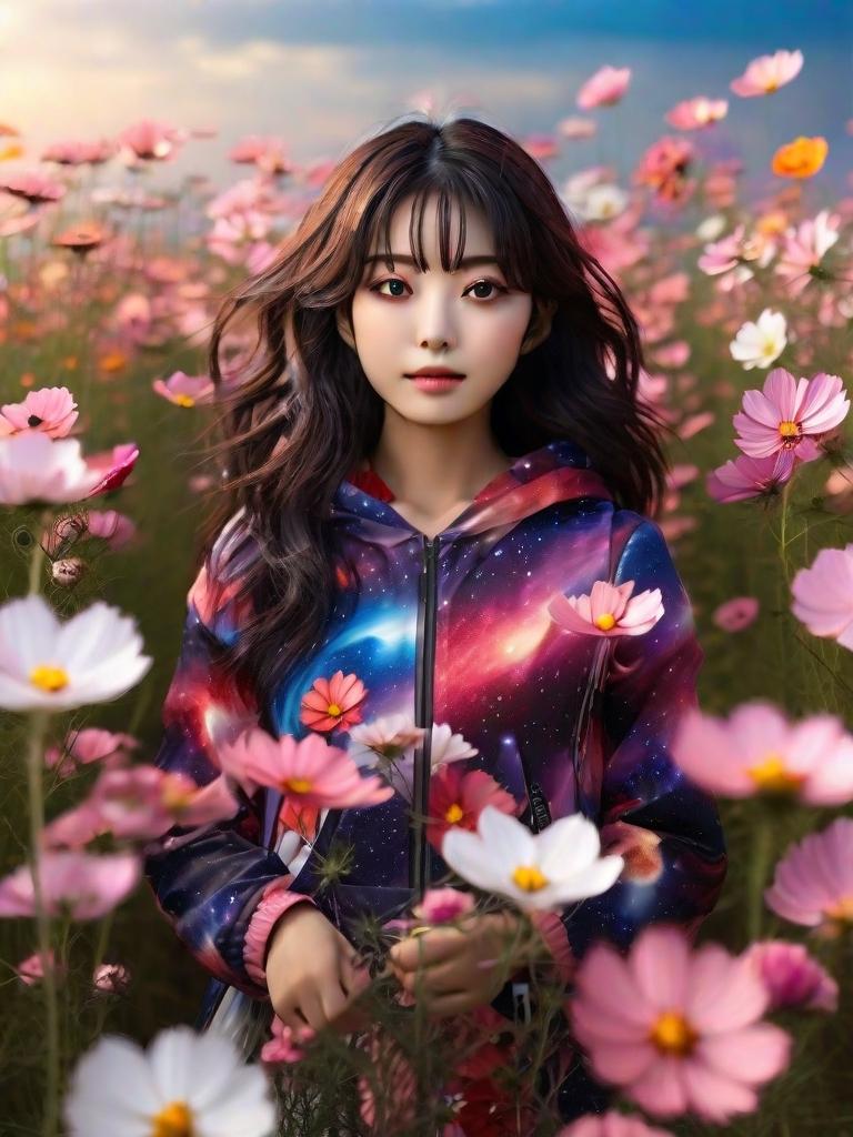 コスモスの花を指定すると、服が宇宙柄になったり、空が天の川になったり、引っ張られてしまいます。
