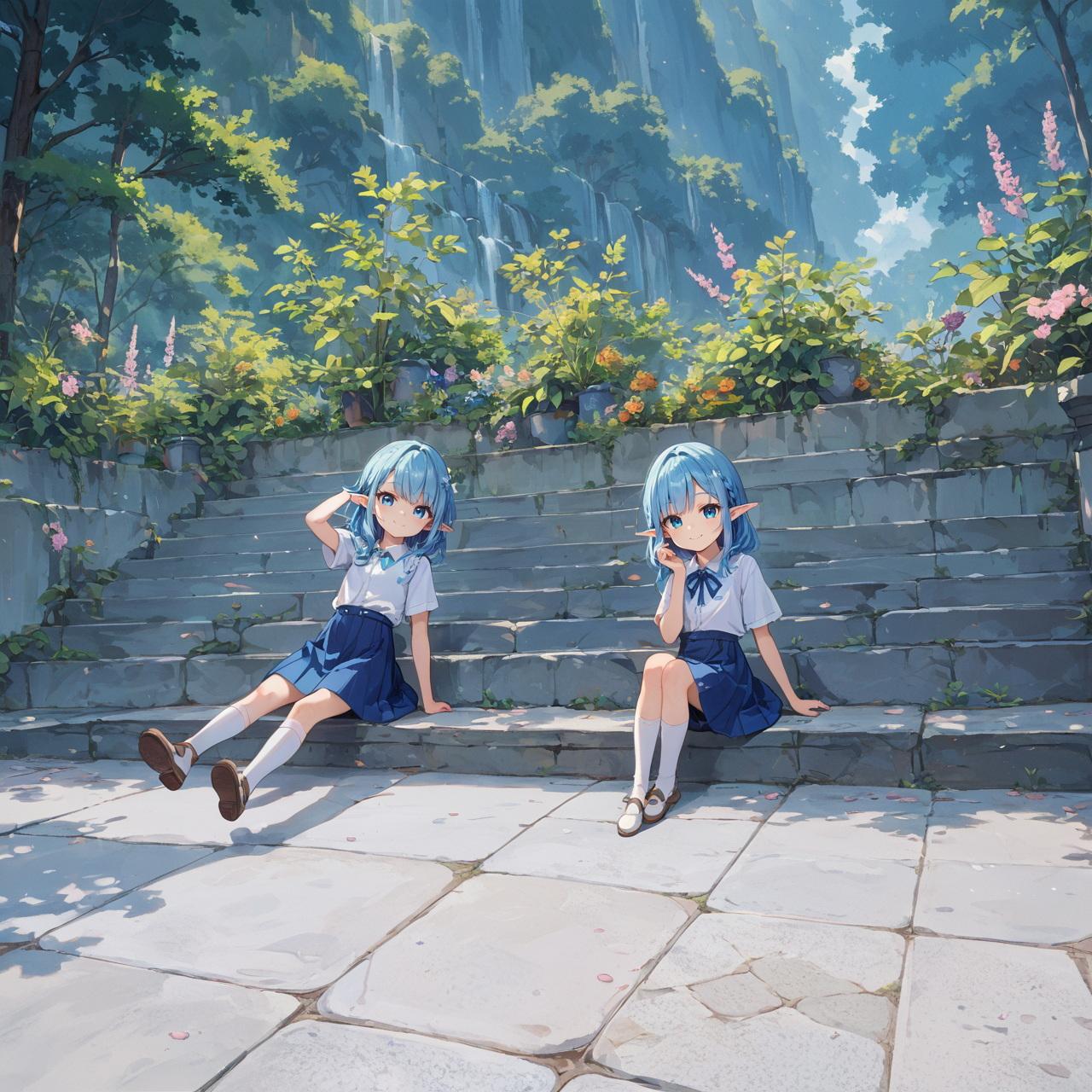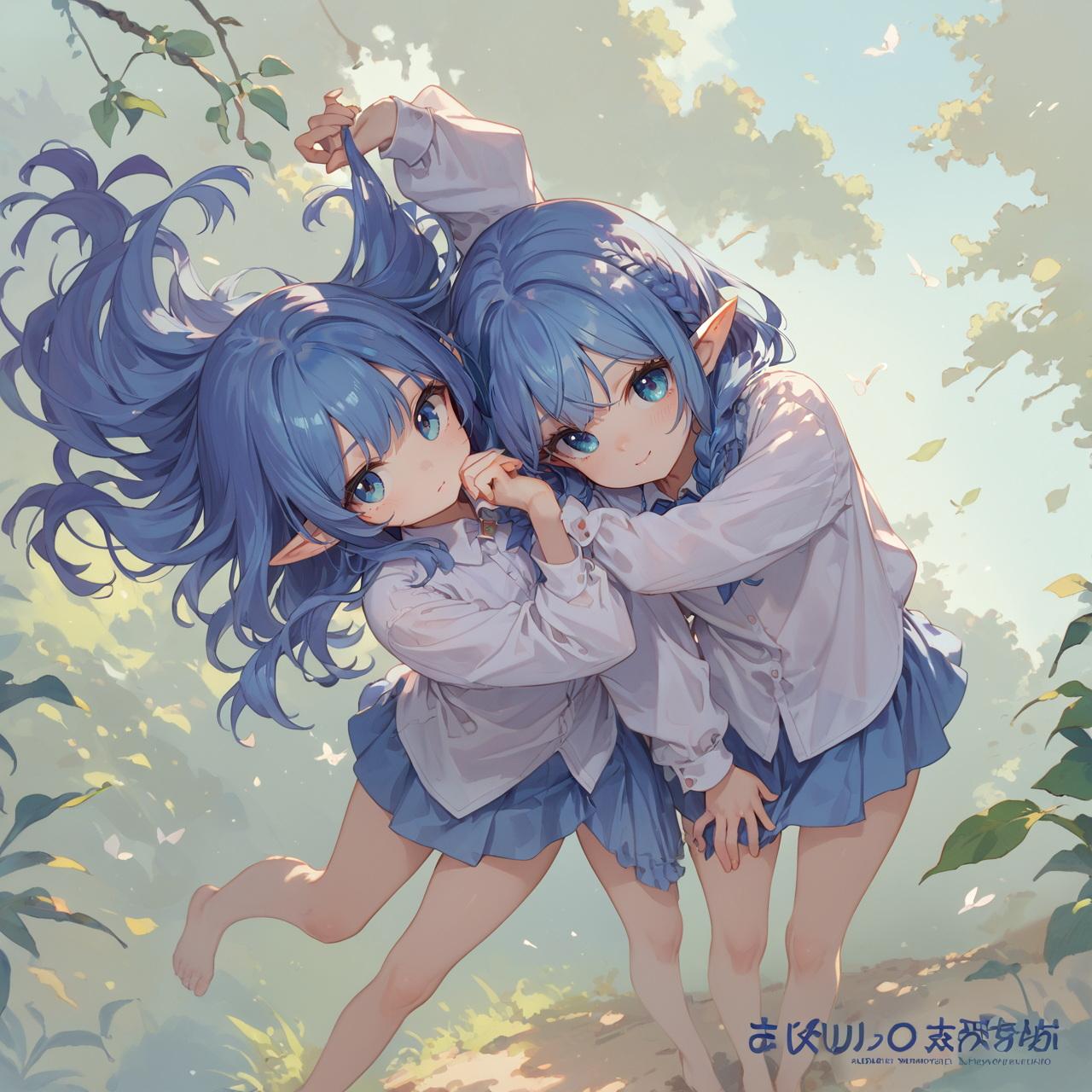 アネ・Ane(青髪のエルフ。おっとりした性格だが魔法は特級クラス、道中は得意の変身魔法で様々なコスプレを楽しんでいる。自由奔放に深い交友関係を築くので、その事で妹に心配をかけている)