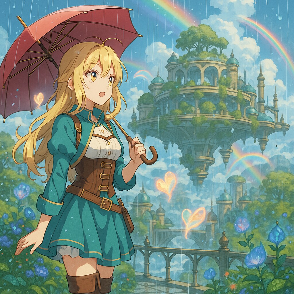 庭園は、浮遊する石橋や光を放つ花々で彩られ、雨の日には「虹環」と呼ばれる七色の輪が空に現れます。雨だからこそ開く“幻灯花”の群生は、まさに異世界の奇跡。