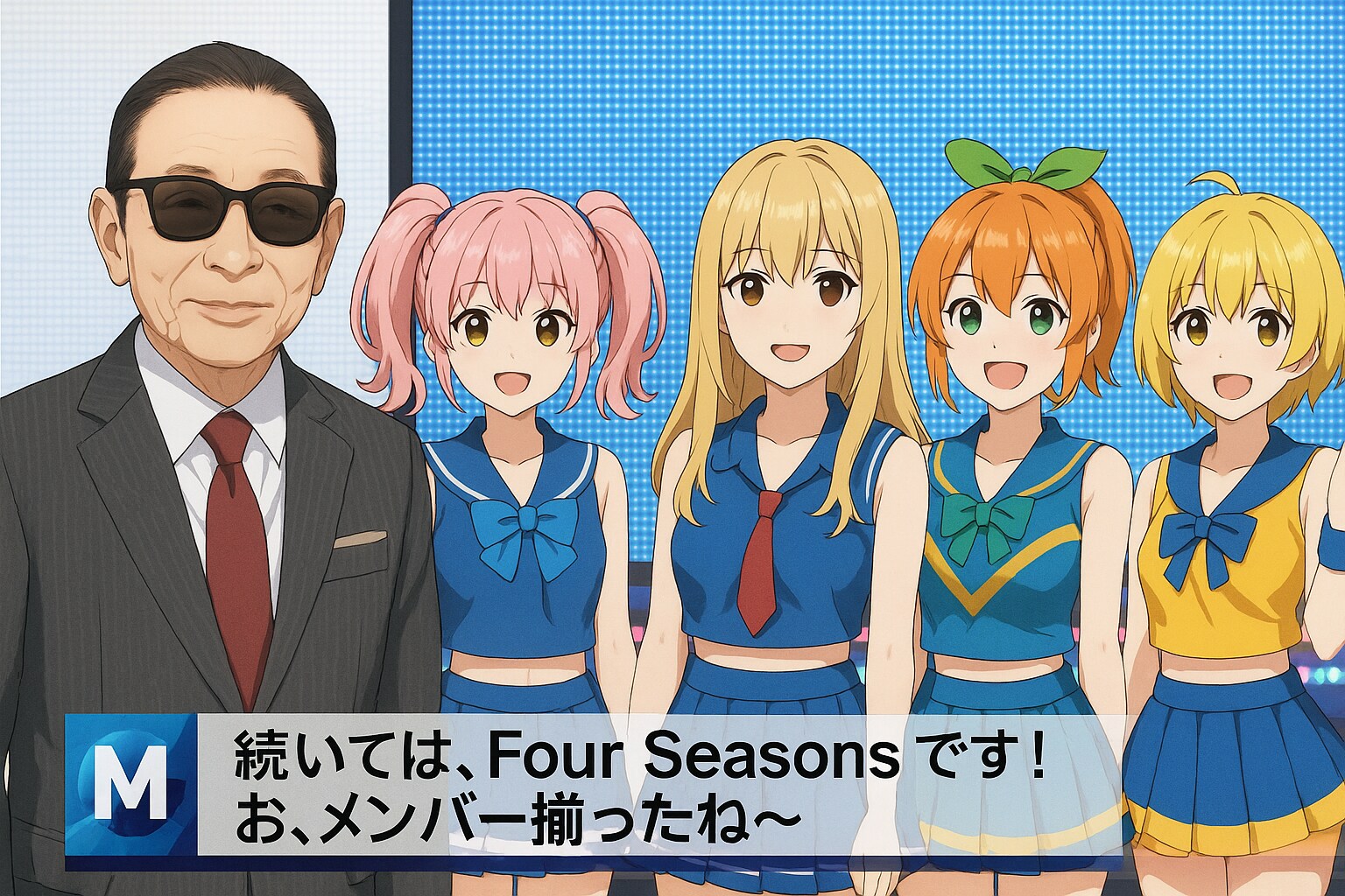 女性アナウンサー「準備は出来ましたでしょうか?Four seasonsミュージックライブラリーより「Girls Beat」「最後の笑顔」「夢の舞台」3曲続けてどうぞ!」