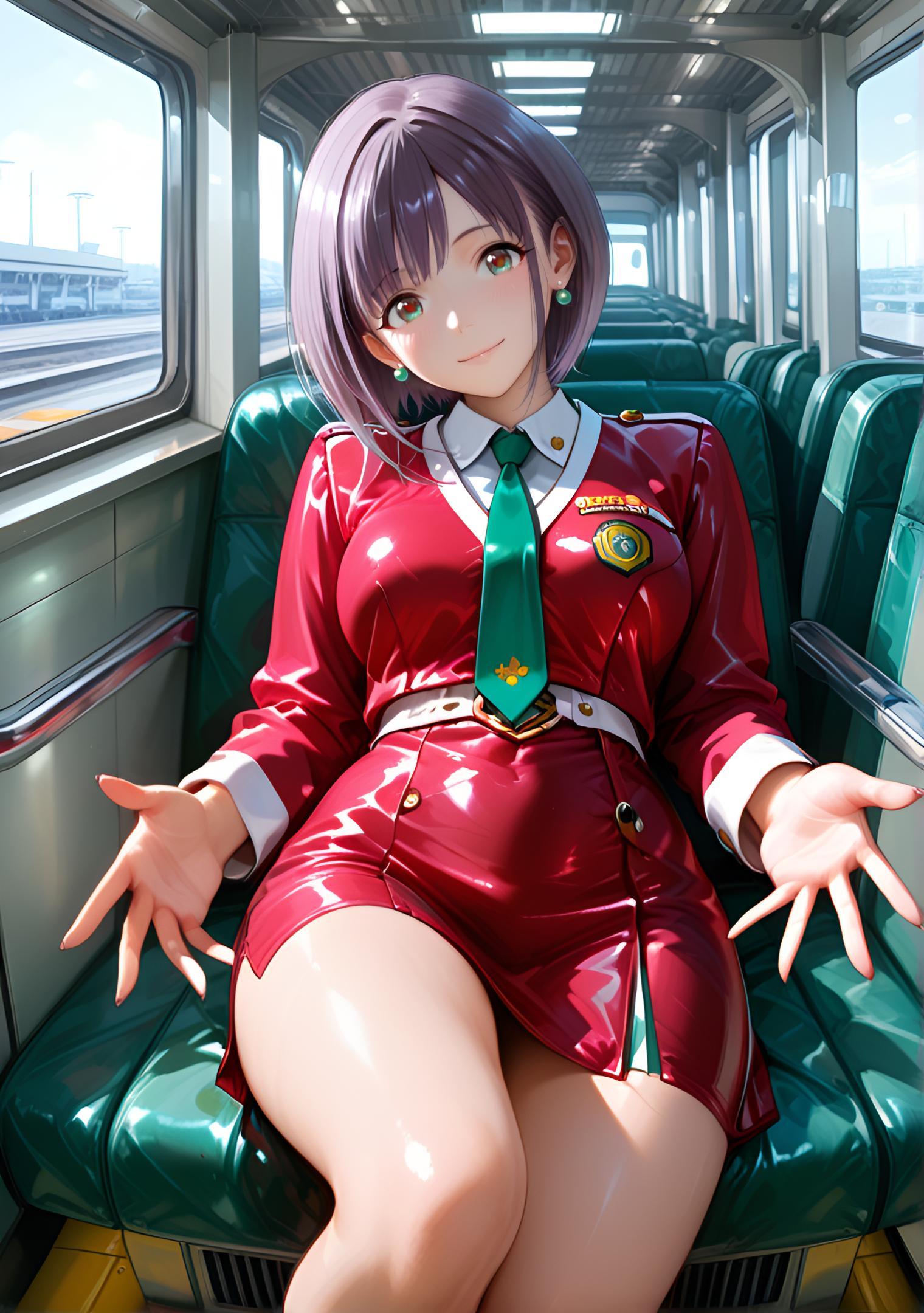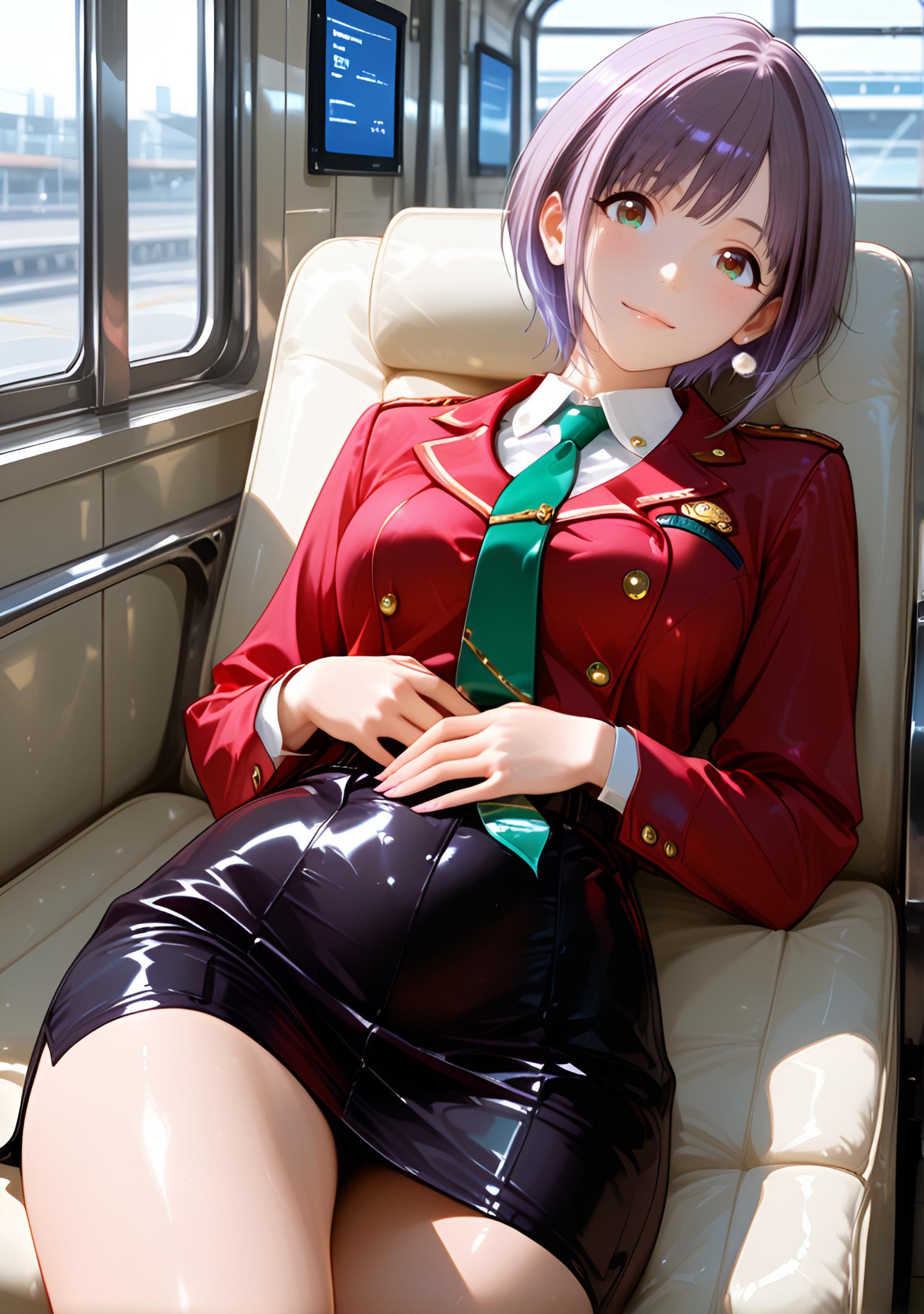 - wine red and violet uniform with silk texture, tight skirt with side slit, emerald silk necktie, small golden badge and earrings # 紅葡スタイリッシュ制服