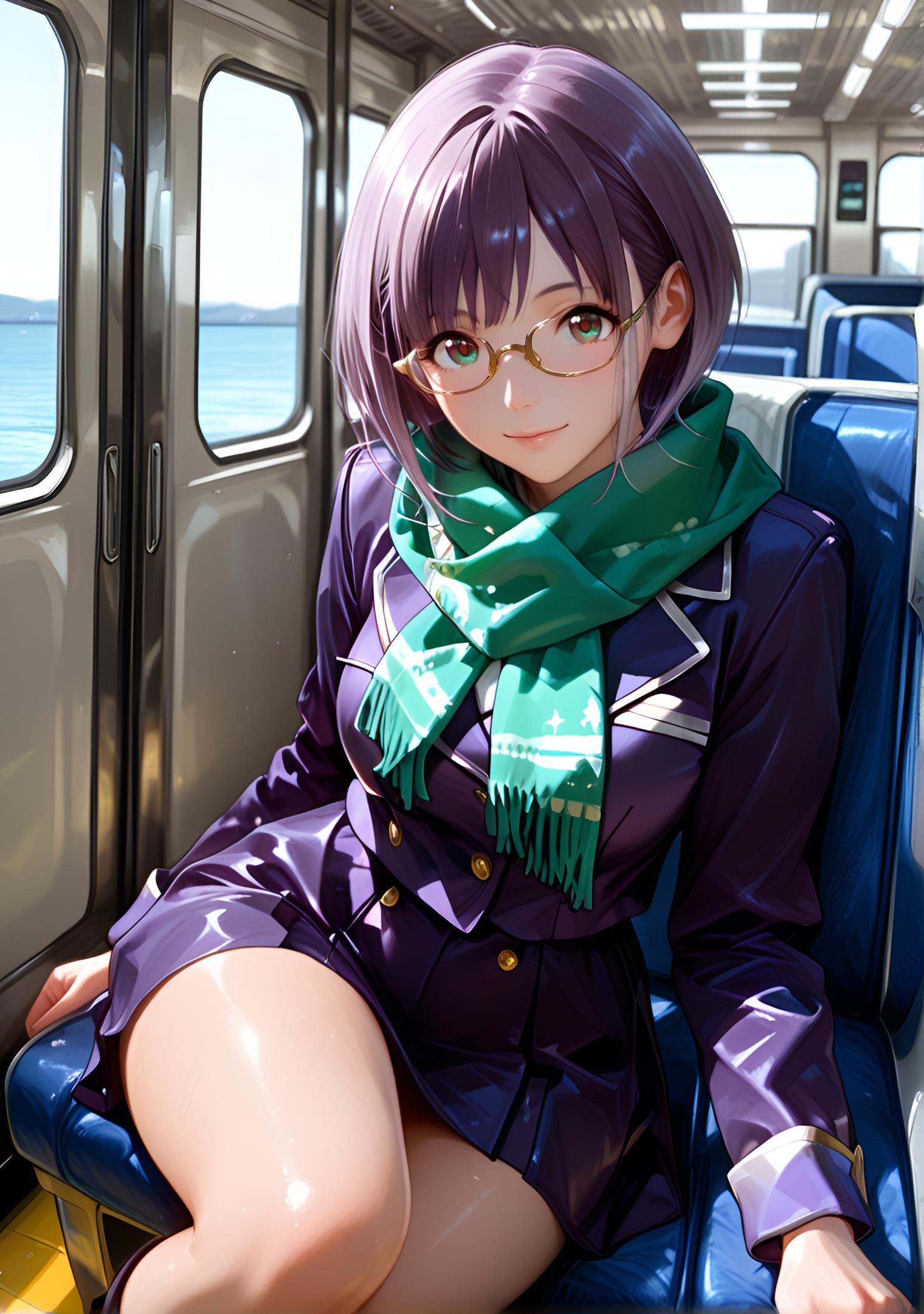 - midnight purple uniform with subtle gold embroidery, tailored jacket and skirt, emerald ribbon scarf and gold-framed glasses accessory # 夜紫エレガント制服