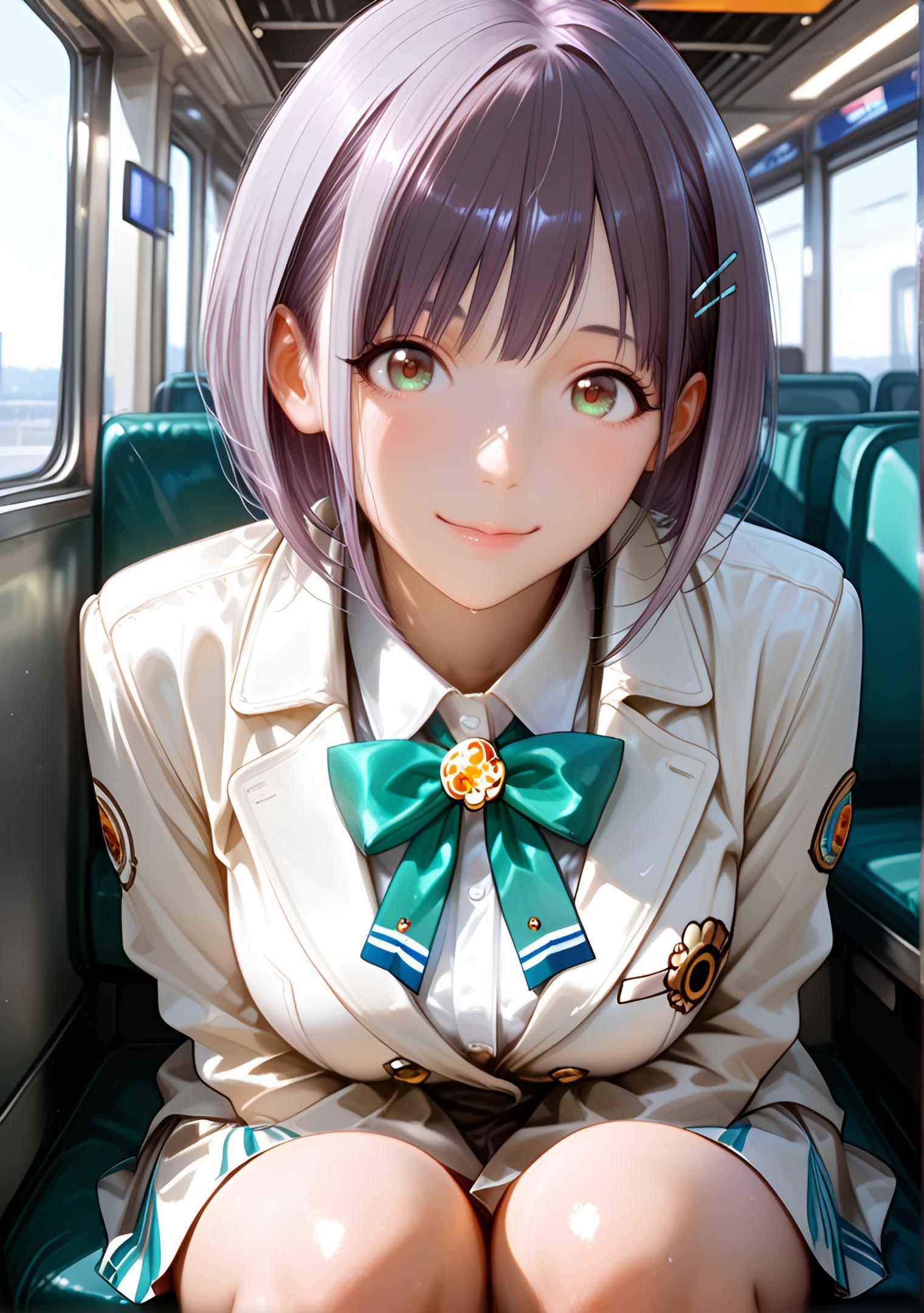 - pure white uniform jacket with violet piping, short jacket style, mint ribbon around neck, transparent crystal brooch and silver hair clip # 白幻スカイライン制服