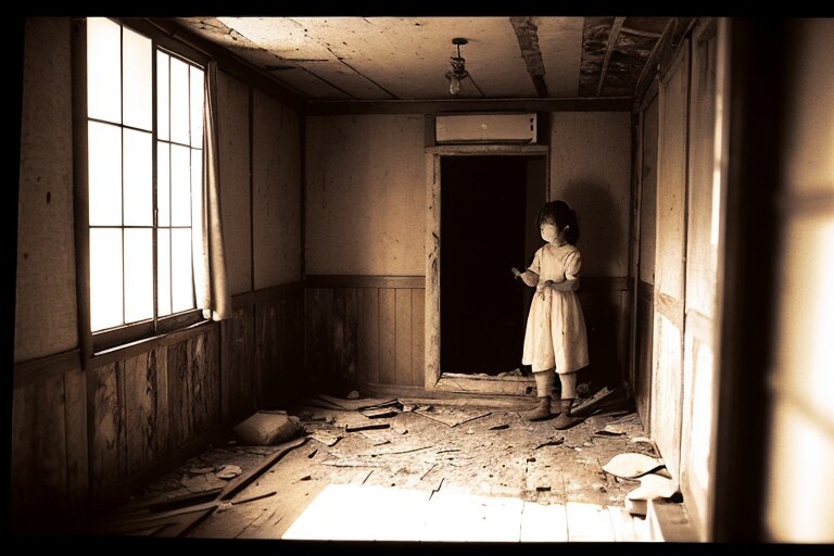 ruined japanese house, (horror:1.5), Interior, total darkness, night, (darkness:1.5), POV, dust, (Film Grain:1.5), (Film Noise:1.5), damaged interior, (sepia:1.5), realistic, Japanese doll