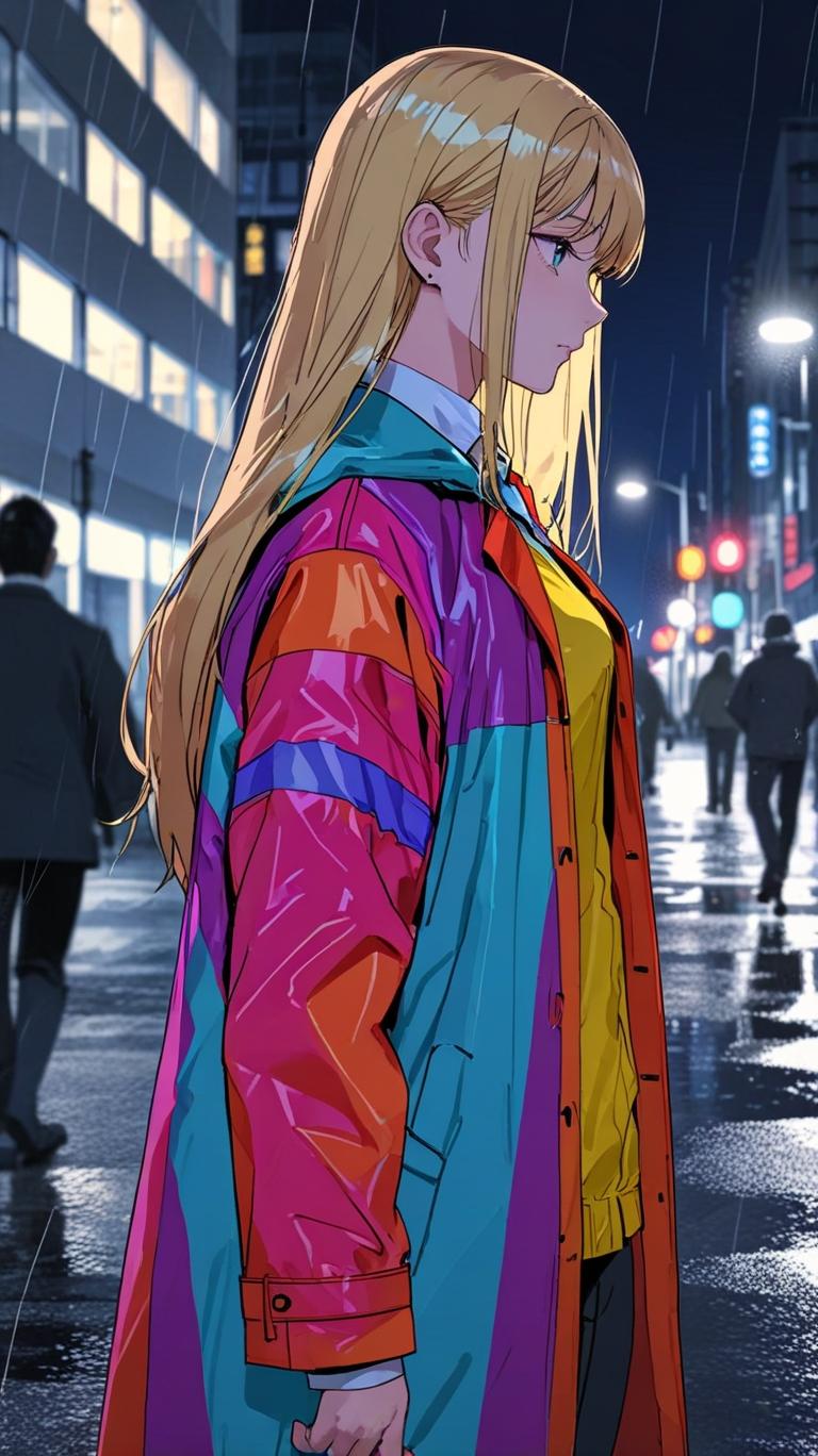 人がいなくなったオフィス街を傘もささずにレインコートで佇む彼女。