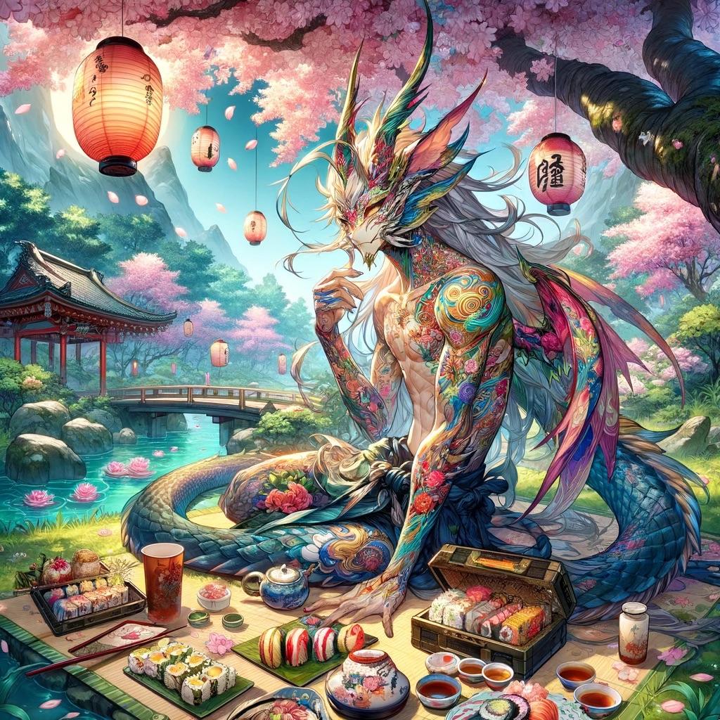 ボディペイントの妖怪が和風の異世界でピクニック。