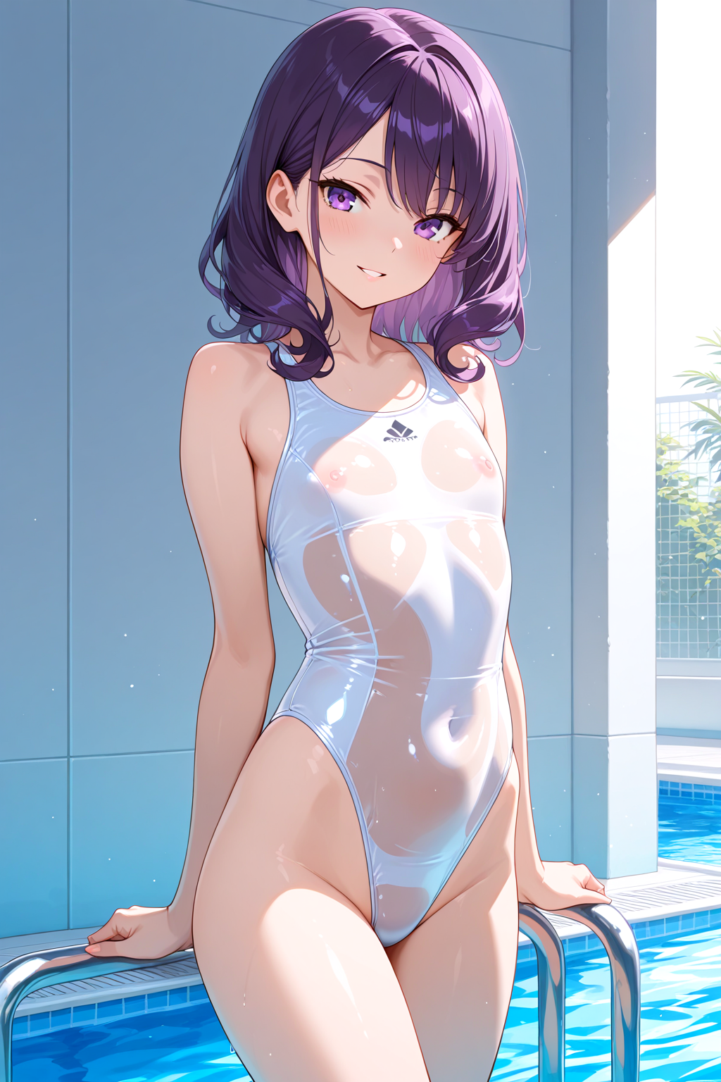 8:1girl,smile,purple eyes,(tsurime:0.8),purple hair,medium hair,curl outward hair,flat chest,mature,