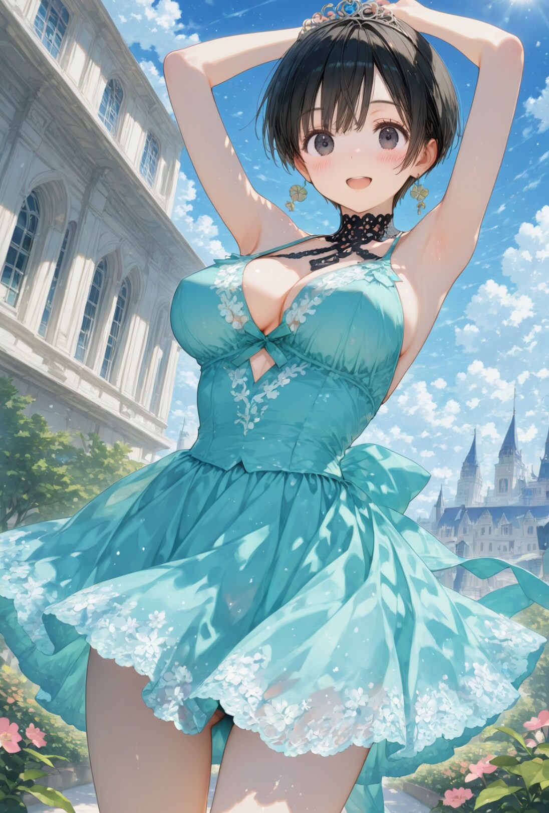 爽やかな青空に映えるミントブルーのドレスからあふれ出そうなお胸とはためくスカートから見え隠れするふとももの白くやわらかな質感に夢心地を感じさせてくれるお姫様