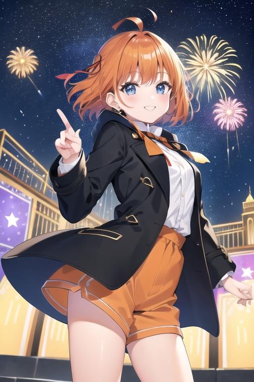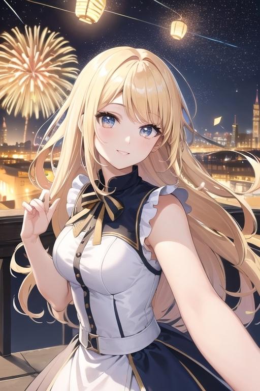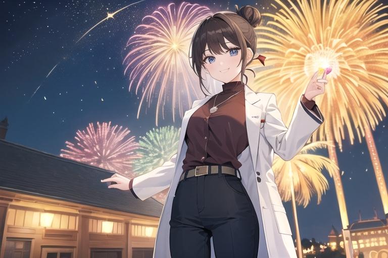 【結局アンドロイドの女性も了承してくれたので、3人は一緒に夜のお祭りにやって来ました。会場に着くと、賑やかな屋台と美しい花火が煌めくなか、すぐにオレンジ髪の少女は元気よくはしゃぎ、アンドロイドの女性もそわそわと周囲の様子をじっと見つめています。そんな2人を見ていた白衣の少女も内心、このお祭りを楽しみにしていました。】