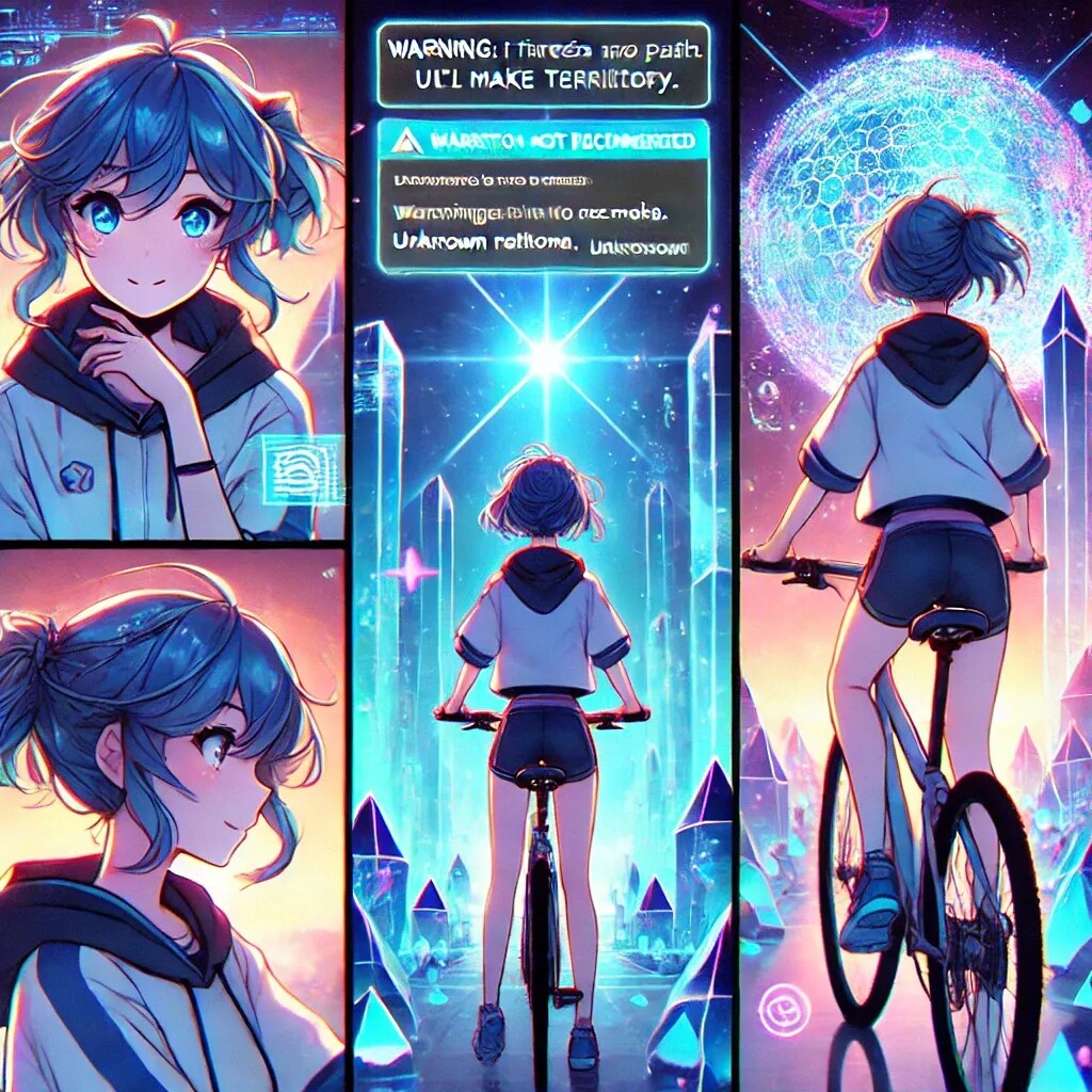 自転車で漕ぎ出す後ろ姿。青い髪が風になびき、背景には広がるノイズ空間がゆっくりと形を成していく。