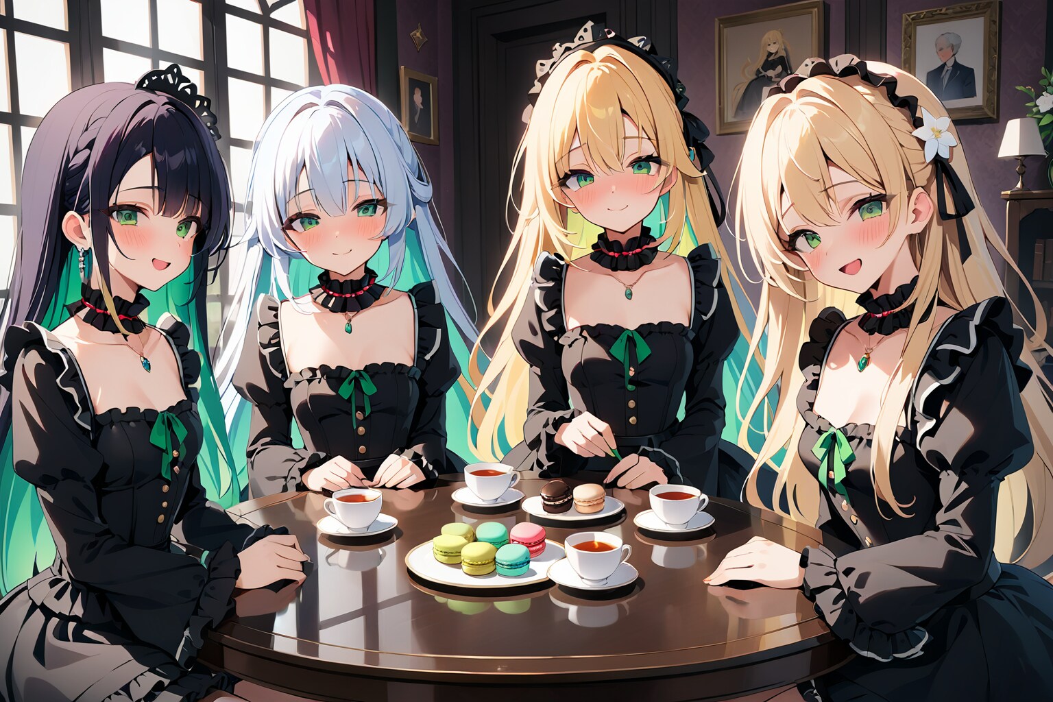 左から順に…ゴスロリクラブの先輩、近影ちゃん、レイメ姉さん、オリシアちゃん