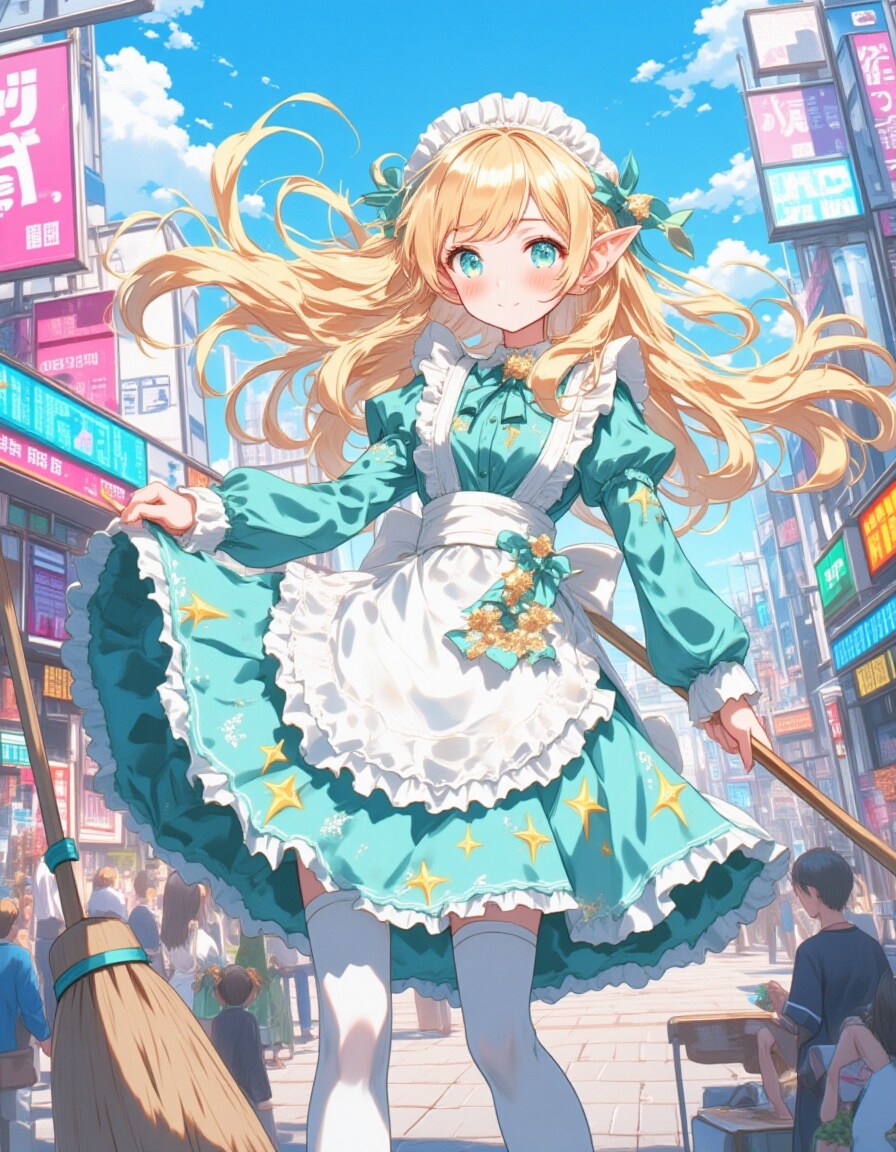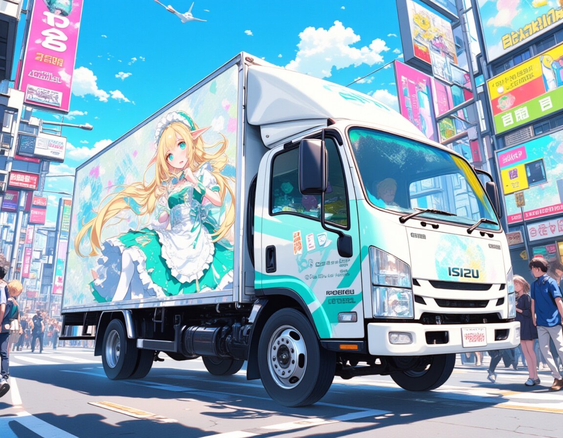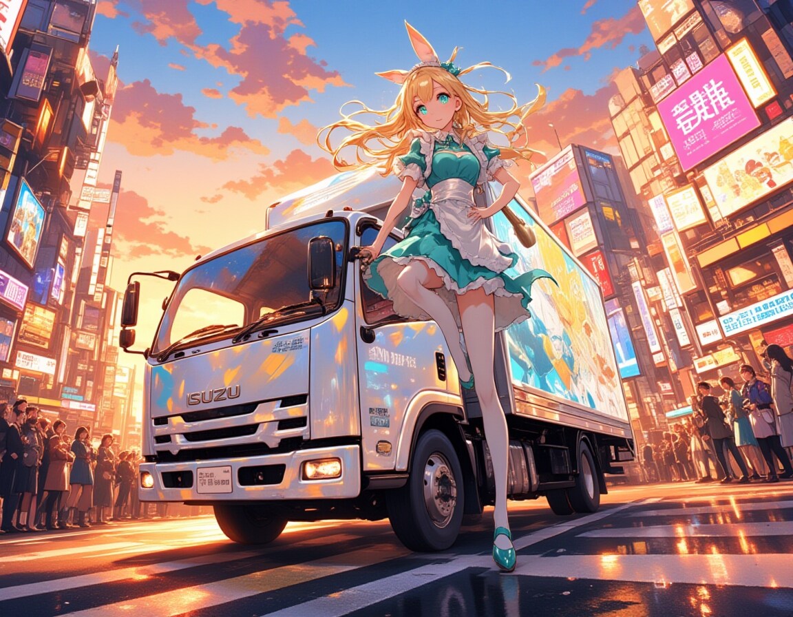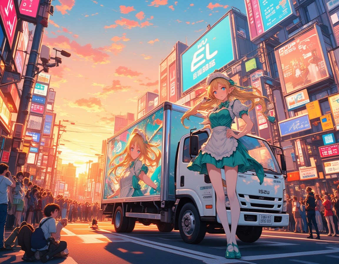 秋葉原の夕暮れに輝くエルフメイドのIsuzu Elfトラック