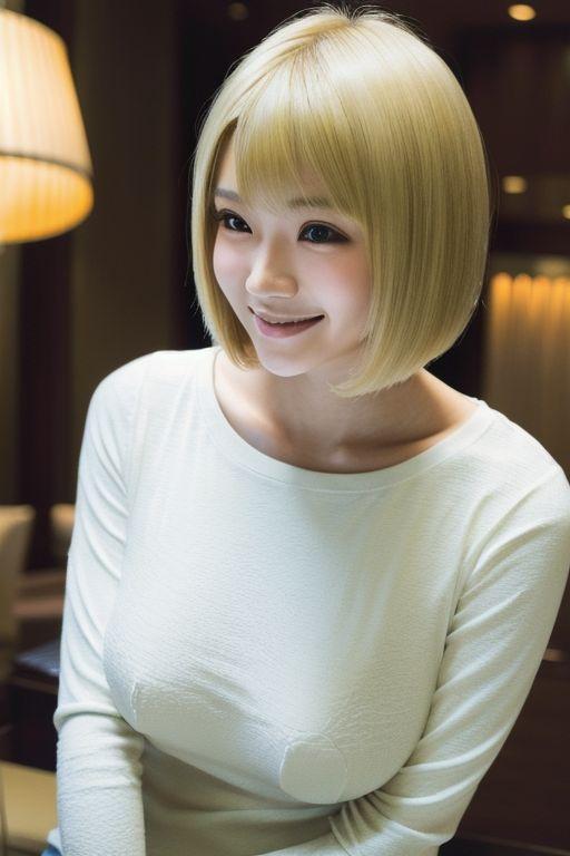 金髪ショートカットヘアの着衣巨乳美女|clothed busty