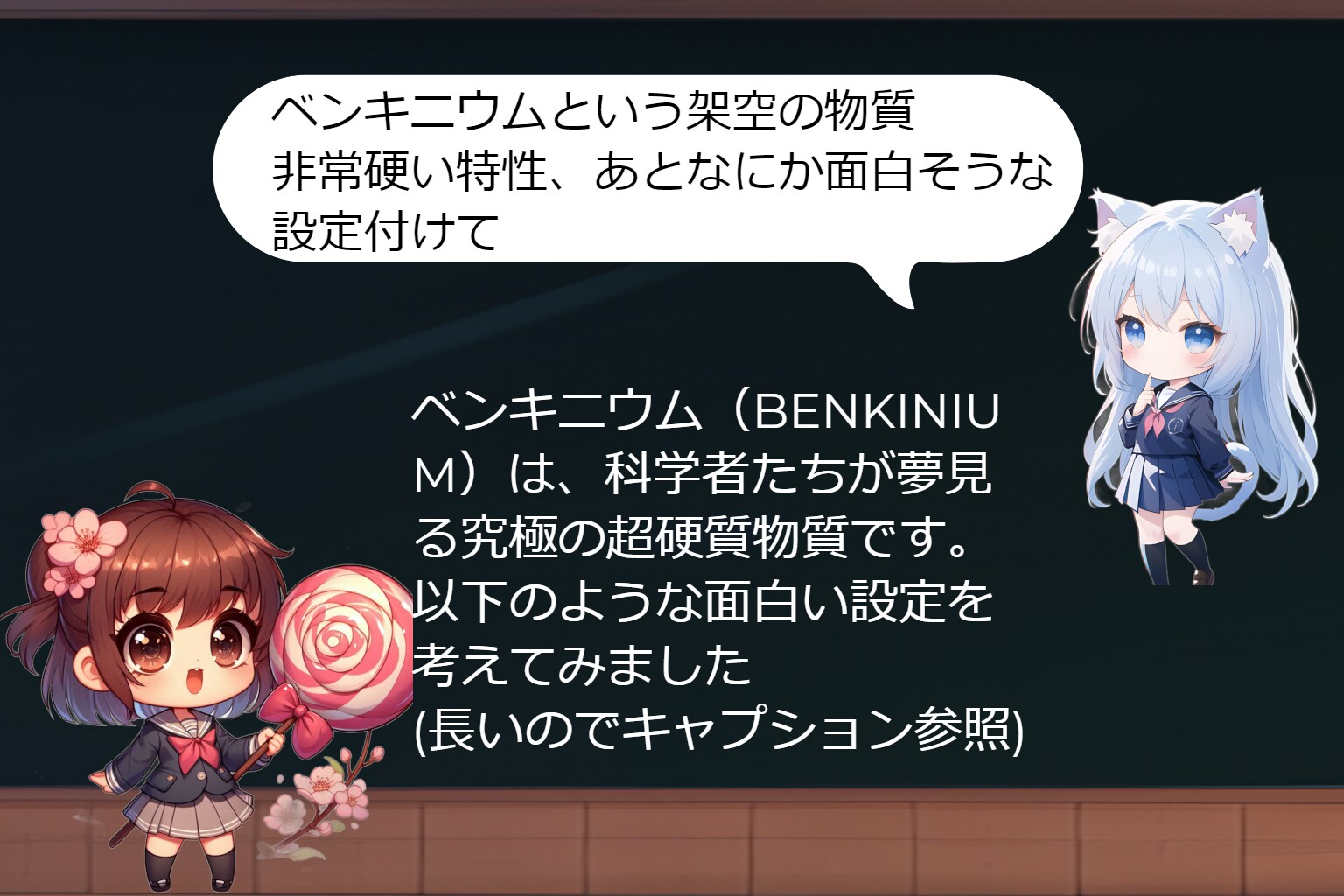 未来の都市: 未来の都市では、ベンキニウムを使った建築物が主流です。これにより、地震や災害に強い都市が実現され、人々は安心して暮らすことができます。