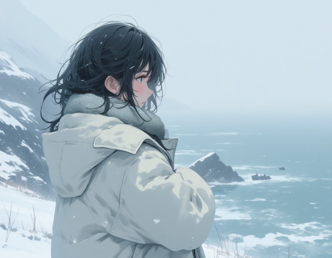 A heartbroken young woman stands at Cape Tappi,looking across the Tsugaru Strait towards the distant shores of Hokkaido. She wears a white down jacket,her breath turning to mist in the icy wind. Her dark hair is tousled by the strong northern gusts as she wraps her arms around herself for warmth. Snowflakes drift through the air,blending with the misty horizon where the cold waves crash against the rugged cliffs. In the background,the faint outline of Hokkaido’s coastline emerges through the winter haze,its snow-covered mountains adding to the scene’s desolate beauty. Her sorrowful eyes reflect the pain of lost love and shattered dreams,mirroring the loneliness of the frozen,windswept landscape. The sky is a muted gray,heavy with the weight of winter,as distant fishing boats dot the frigid waters.,