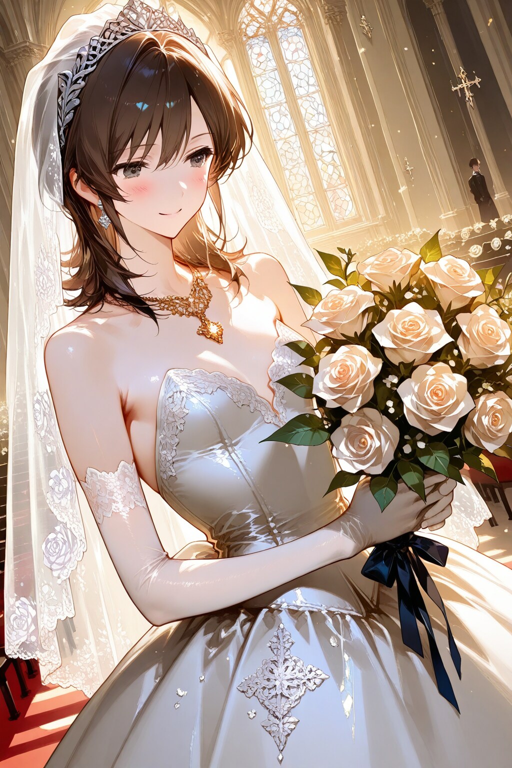 最後に、ブーケトスが行われた。実織は振り返り、美咲に向かって小さなブーケを軽く投げた。美咲が笑顔で受け止め、「次は私の番かな?」と冗談を言うと、場がほっこりした空気に包まれた。限られた祝福の中、二人は互いの手を強く握り、新たな人生の第一歩を踏み出した。
