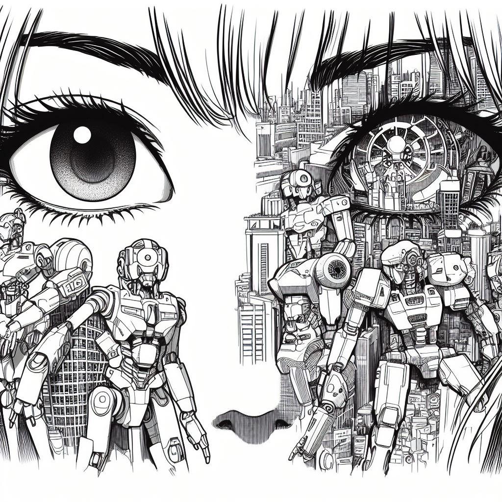 彼女の瞳に映るのは、ロボットや機械が溢れる未来都市。