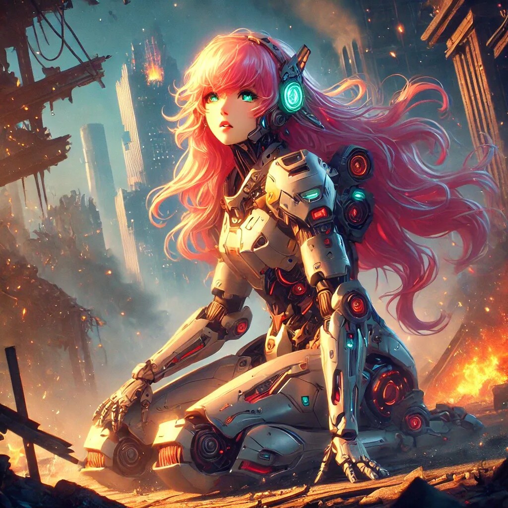 廃墟と化した都市で、青髪ボブ子ちゃんの姉のメカ娘が膝をつく。高性能なアーマーは傷つき、片腕は機能停止。華やかだった彼女の姿に、今は疲弊と焦りが滲む。