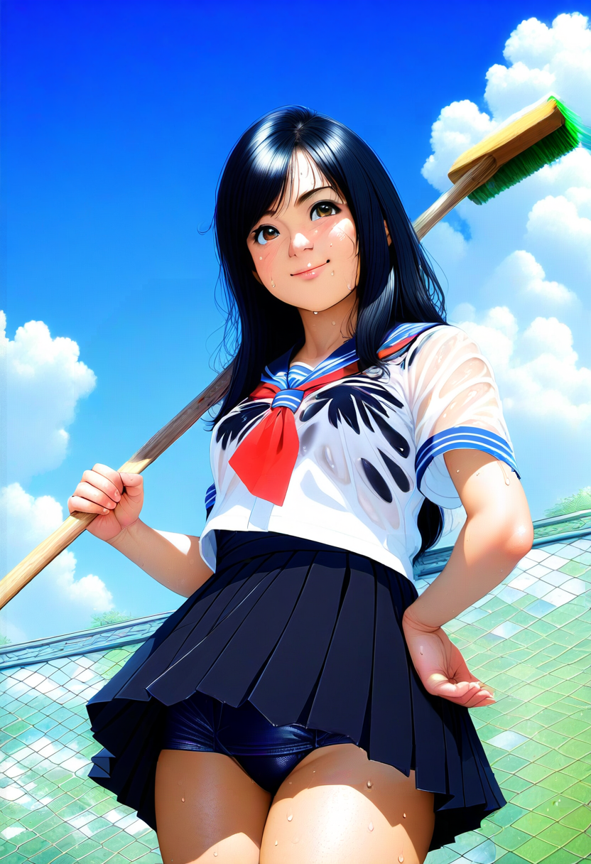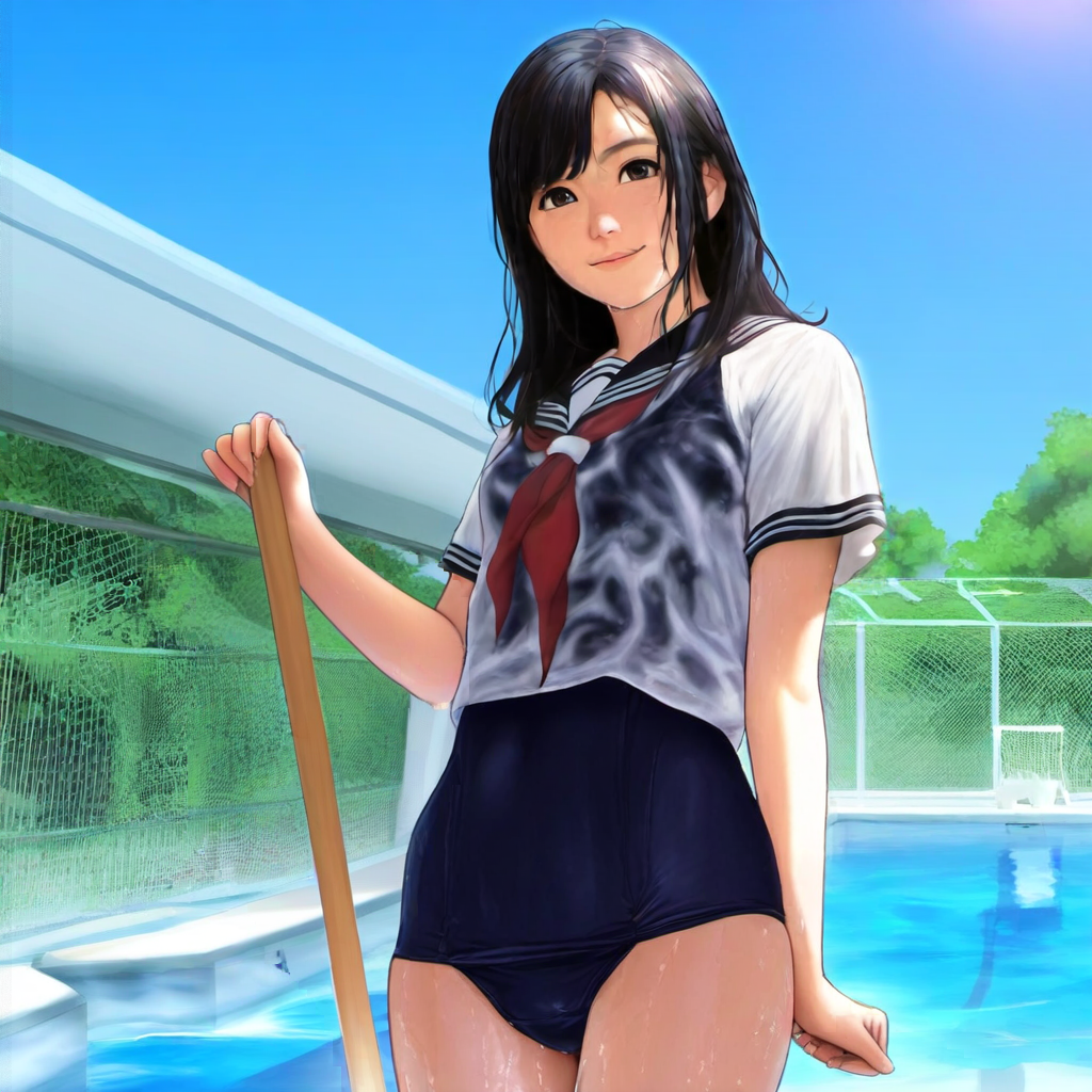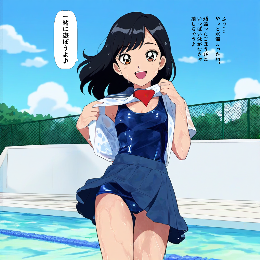 ④ big smile, open mouth, school pool, wet clothes, poolside, wire fence, undresshing skirt,