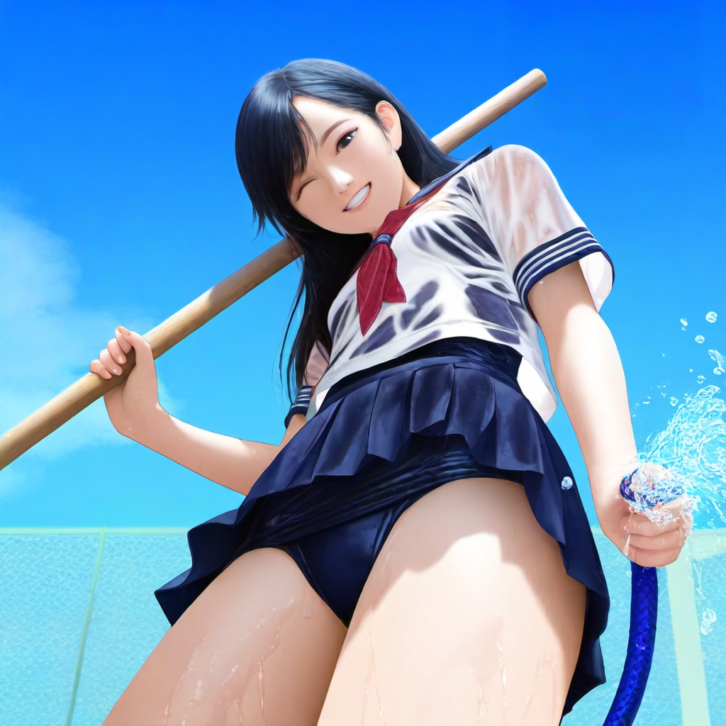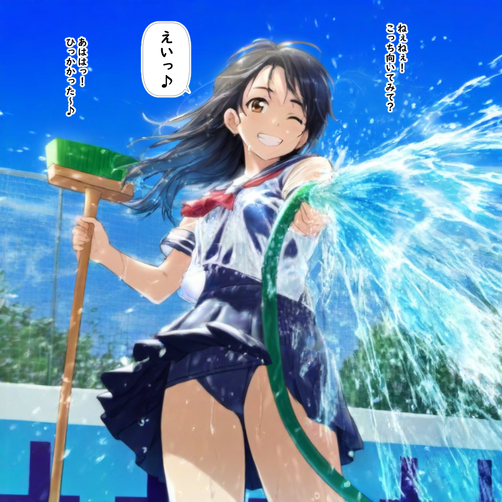 ①soaking wet shirt, wet, wet hair, one eye closed, grin, outdoors, day, sky, school pool, empty pool, pool ladder, deck brush, green brush, water hose, pointing water splashing hose,