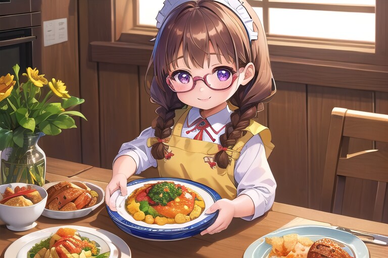 食欲の秋参加で委員長ちゃんの食事の準備風景を描こうとあがいてみました(苦笑)。他の方のプロンプトを参考にしよう色々見てますがなかなか難しいですね。秋っぽさを出せるように色々考えてみたいところです。委員長ちゃんの身体の小ささが上手くでてる画像が多かったのは良かったですね。