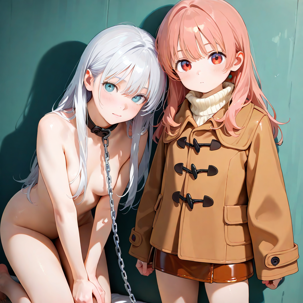 彼女たちは、世間が愛と呼ぶものを、一般的な形では享受していなかったかもしれない。サヤカがダッフルコートの暖かさに包まれ、アリアが冷たい鎖に繋がれているというこの構図は、外から見れば支配と服従の関係に見えるだろう。しかし、二人の間で交わされているのは、魂の奥底で結ばれた**絶対的な信頼と献身**だった。この鎖は、アリアにとってはサヤカの存在を物理的に感じられるための**媒介**であり、自由な世界の不確かさから彼女を隔離し、サヤカの永遠の愛の中に囲い込むための**安全装置**でもあった。