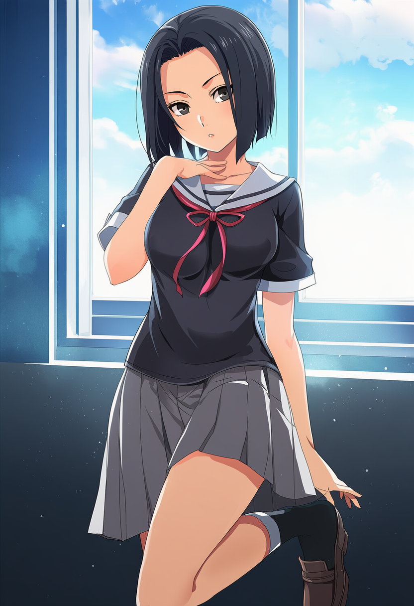 black serafuku,short sleeves,white sailor,red ribbon,grey skirt,high socks,Loafer
